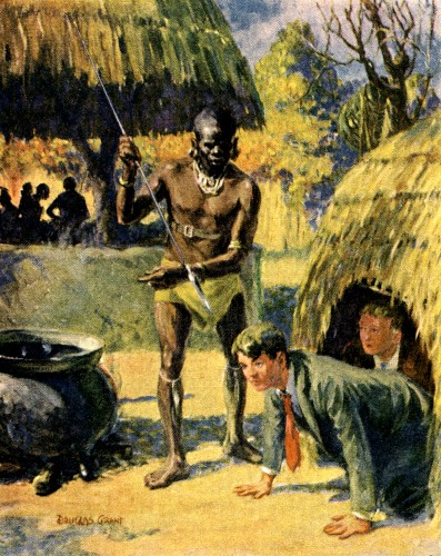 As they had previously planned, the three crept stealthily along the rear of the village huts, keeping close to the palisade. Dick led, Ukundo followed, and then Doc. They had to move very silently lest they awaken some of the numerous village curs, whose yapping might easily arouse the entire village. And so they moved forward very slowly, often just a few yards at a time, when they would lie quietly for several minutes. It was slow, nerve-wracking work. The hut in which Bulala was confined seemed miles away, though in fact it was but a few hundred feet. At last, however, after what seemed an eternity, they reached it and while the boys waited behind the hut, Ukundo crept to the front and crawled inside.
