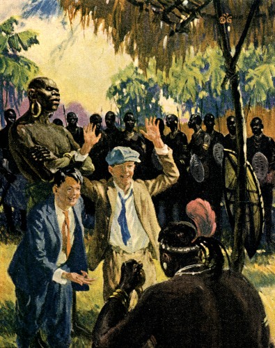 The warriors tossed aside their weapons. "Welcome Big Bwana!" "Welcome, Tarzan!" they called.