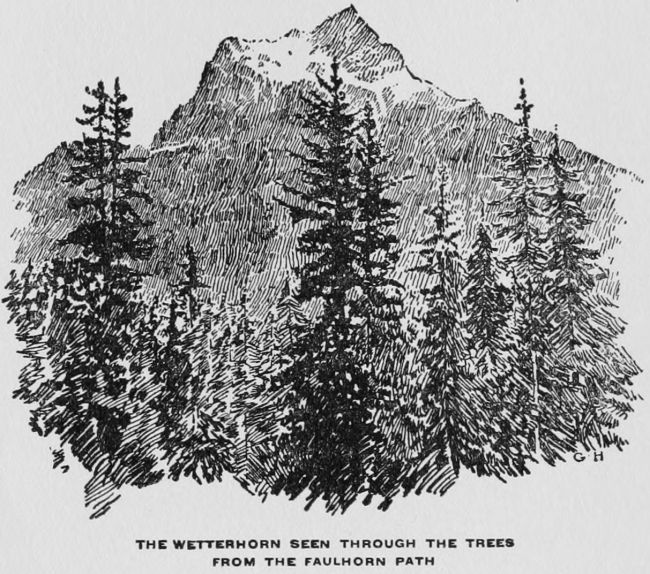 We soon decided that it was a waste of time to eat our meals in a stuffy little dining-room, looking out only at an upward slope of grass,[28] even though it was adorned with two chamois and a Schützenfest prize. So we had the deal table and the chairs transferred to the more private of the lower balconies, the one that did not communicate with the street; and we found that the Eiger and Mettenberg and the Lower Glacier, the whole regal glory of our outlook, added a wonderful savor to our simple repasts,—changed the prosaic process of eating, in fact, into a sort of Magnificat. For it is true that there are places in this world which make even a pagan feel religious, and among all the winds and rains and fields and rivers and beasts and stars which “praise the Lord,” there are none which entone their hymns in a voice more inspiringly audible than the mountains which lift their snow-crowned heads so near to Heaven.