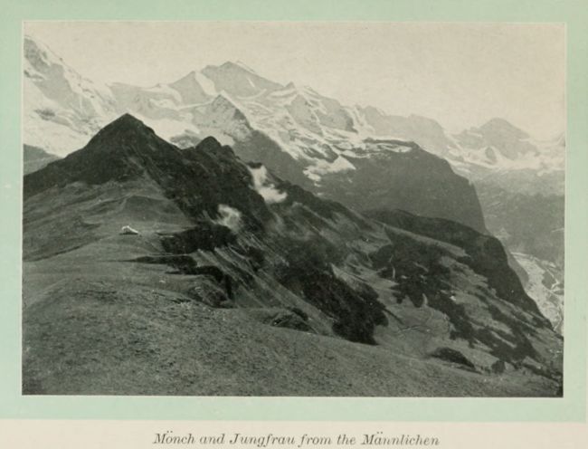 The other Männlichen trip was vastly different. The day was clear as a bell—radiant, perfect. We walked down to the Grund station and took the train as far as Alpiglen only, about half way to the Scheidegg. You see we were learning to climb by then. We took a lovely (though sometimes unfindable) cross-slanting path from there to the Männlichen, and all the way kept opening up more and more glorious vistas. Starting with a backward look[45] into the Grindelwald Valley and at our own Wetterhorn and Eiger, we uncovered the Mönch first and then the Jungfrau, with her beautiful shining sub-peaks, the Silberhorn and Schneehorn, and finally, when we got to the top of the ridge, there was that surprising hole in the ground, the Lauterbrunnen Valley, with all its waterfalls tumbling down the rock walls of the opposite side. Beyond were more snow mountains and to the westward Lake Thun and Lake Brienz, Interlaken and more snow mountains. I do truly think the view from the Männlichen is the finest in Switzerland, if not in the whole world. The view from the Gornergrat is a wilderness of glaciers, utterly magnificent, but lacking in variety. The view from the Rigi is a panorama of distant objects and lacks the stupendous foreground supplied for the Männlichen by that trio of colossi, Eiger, Mönch and Jungfrau.