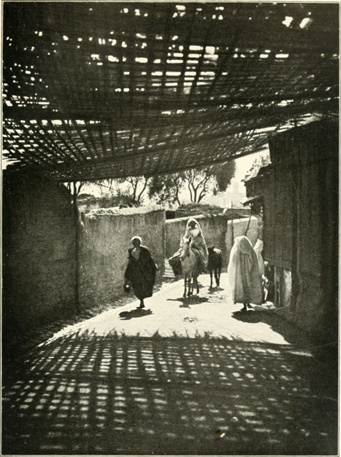 Between these nomad colonies lies the bled, the immense waste of fallow land and palmetto desert: an earth as void of life as the sky above it of clouds. The scenery is always the same; but if one has the love of great emptinesses, and of the play of light on long stretches of parched earth and rock, the sameness is part of the enchantment. In such a scene every landmark takes on an extreme value. For miles one watches the little white dome of a saint's grave rising and disappearing with the undulations of the trail; at last one is abreast of it, and the solitary tomb, alone with its fig-tree and its broken[Pg 10] well-curb, puts a meaning into the waste. The same importance, but intensified, marks the appearance of every human figure. The two white-draped riders passing single file up the red slope to that ring of tents on the ridge have a mysterious and inexplicable importance: one follows their progress with eyes that ache with conjecture. More exciting still is the encounter of the first veiled woman heading a little cavalcade from the south. All the mystery that awaits us looks out through the eye-slits in the grave-clothes muffling her. Where have they come from, where are they going, all these slow wayfarers out of the unknown? Probably only from one thatched douar[1] to another; but interminable distances unroll behind them, they breathe of Timbuctoo and the farthest desert. Just such figures must swarm in the Saharan cities, in the Soudan and Senegal. There is no break in the links: these wanderers have looked on at the building of cities that were dust when the Romans pushed their outposts across the Atlas.