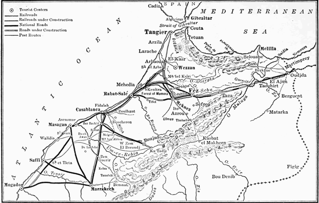 Ten years ago there was not a wheeled vehicle in Morocco; now its thousands of miles of trail, and its hundreds of miles of firm French roads, are travelled by countless carts, omnibuses and motor-vehicles. There are light railways from Rabat to Fez in the west, and to a point about eighty-five kilometres from Marrakech in the south; and it is possible to say that within a year a regular railway system will connect eastern Morocco with western Algeria, and the ports of Tangier and Casablanca with the principal points of the interior.