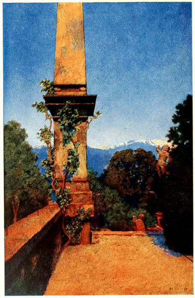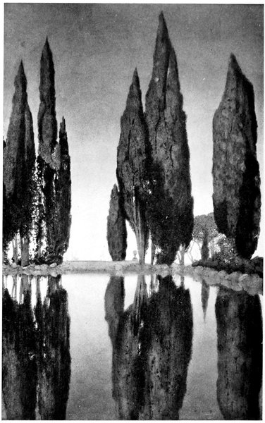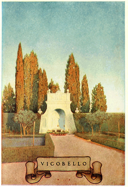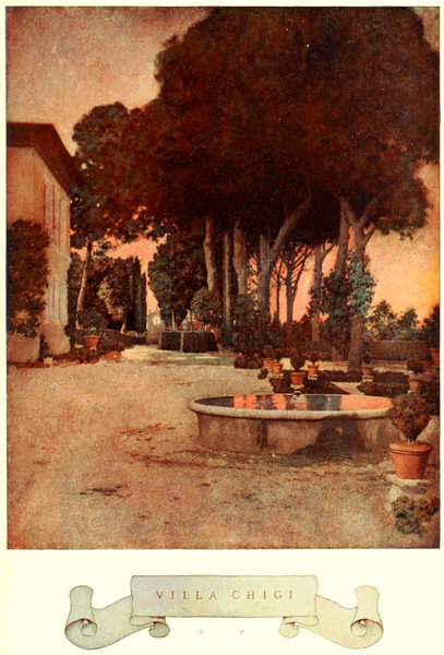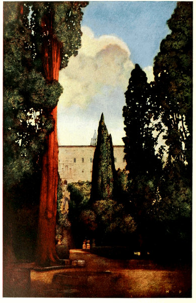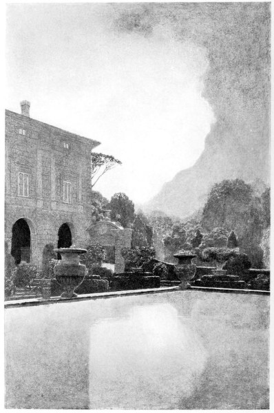 Some of those who have fallen under the spell are inclined to ascribe the Italian garden-magic to the effect of time; but, wonder-working as this undoubtedly is, it leaves many beauties unaccounted for. To seek the answer one must go deeper: the garden must be studied in relation to the house, and both in relation to the landscape. The garden of the Middle Ages, the garden one sees in old missal illuminations and in early woodcuts, was a mere patch of ground within the castle precincts, where “simples” were grown around a central wellhead 7and fruit was espaliered against the walls. But in the rapid flowering of Italian civilization the castle walls were soon thrown down, and the garden expanded, taking in the fish-pond, the bowling-green, the rose-arbour and the clipped walk. The Italian country house, especially in the centre and the south of Italy, was almost always built on a hillside, and one day the architect looked forth from the terrace of his villa, and saw that, in his survey of the garden, the enclosing landscape was naturally included: the two formed a part of the same composition.