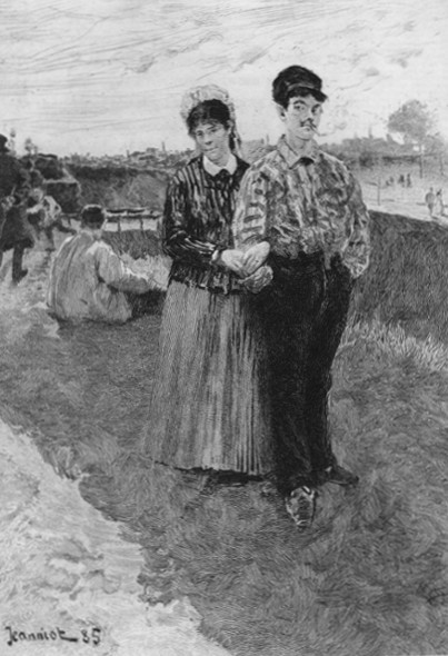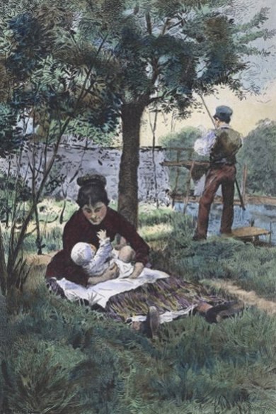 And when summer came they stayed there all day, at the foot of the garden, on the bank of the stream—Jupillon on a laundry board resting on two stakes, pole in hand, and Germinie sitting, with the child in her skirts, under the medlar tree that overhung the stream.
