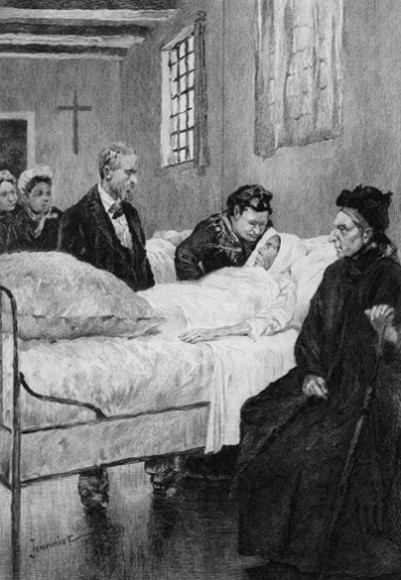 When we returned home, we must look through her papers, get her clothes together, sort out the clutter of phials, bandages and innumerable things that sickness collects—jostle death about, in short. It was a ghastly thing to enter that attic, where the crumbs of bread from her last meal were still lying in the folds of the bedclothes. I threw the coverlid up over the bolster, like a sheet over the ghost of a dead man.
