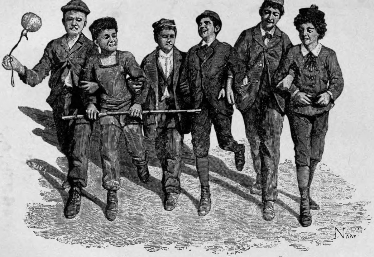 When I went out, I felt oppressed by the commotion. We all ran out confusedly. Boys were emerging from all the other class-rooms also. There was a great mixing and tumult of boys and parents, bidding the masters and the mistresses good by, and exchanging greetings among themselves. The mistress with the red feather had four or five children on top of her, and twenty around her, depriving her of breath; and they had half torn off the little nun’s bonnet, and thrust a dozen bunches of flowers in the button-holes of her black dress, and in her pockets. Many were making much of Robetti, who had that day, for the first time, abandoned his crutches. On all sides the words were audible:—