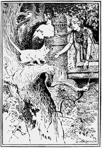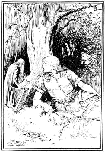 That night also Fergus went to the forest, not too sad, because there was a vague hope in his heart that had never been there before. He lay down under the branches, with his feet towards the rustling waters, and the smiles of the princess gilded his slumbers, as the rays of the rising sun gild the glades of the forest; and when the morning came he was scarcely surprised when before him appeared the little old woman with the shuttle he had welcomed on the winter’s night.