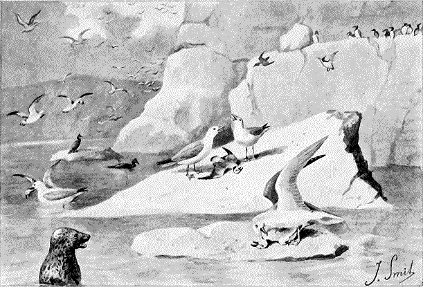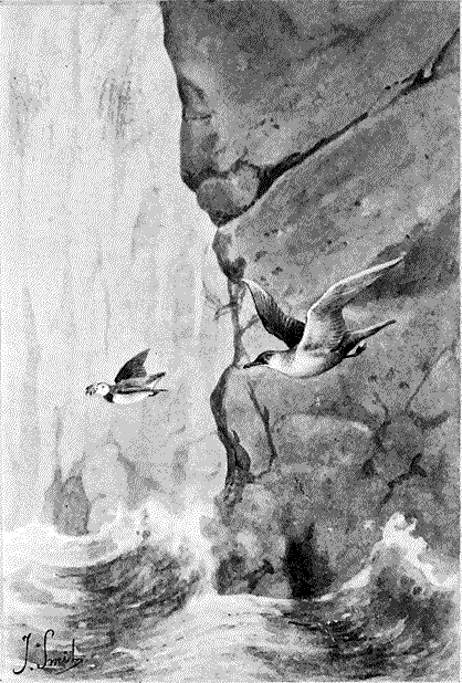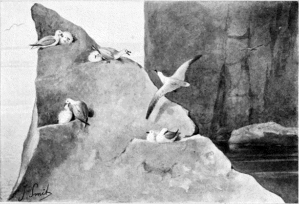It is curious how the gulls cling to their breeding-places long after the breeding-time is over. Summer—or say July—is now fast waning, yet in the way they stand amidst the heather, rise as I approach, and float, shrieking, above me, it is just as it was last time « 6 » I was here, which was in early June, when things were hardly more than beginning. Any one not knowing the time of the year—and it is difficult to tell in the Shetlands—might expect from the birds' actions and the general appearance of the whole community, to find eggs and newly-hatched chicks all about; but all are gone, and the nests now hardly to be distinguished from the surrounding heather. A few young birds there are, but they are of large size, though unable as yet—or scarcely able—to fly. It is the habit of these, when approached, to crouch and lie flat along the ground, without making any attempt to escape, even allowing themselves to be stroked and taken up in the hand. When set down again, however, they generally start off running, and often get to a great distance before they stop. Young terns and young peewits do just the same thing, and it is curious that in their manner of thus crouching, before the power of flight has been fully gained, they exactly resemble the stone-curlew, in which bird the habit is permanent, though not, I should say, very frequently indulged in after maturity has been reached. As no adult gull or peewit crouches in this way, we must suppose either that natural selection has infixed a certain habit in the young bird, suited to its flightless condition, or that in thus acting it reverts to a trick of its ancestors, which were presumably, in that case, flightless, through life. The clinging of the stone-curlew to the early habit seems to support the latter supposition, and primâ facie it is perhaps more probable « 7 » that crouching in a bird should have come before flying than after it, or, at least, that it should have been resorted to by certain species, on account of their flight having become weak. It is conceivable that some birds may have alternately lost and reacquired the power of flight many times in their genealogical history. But where have the majority of the young gulls gone? That they have left the island seems evident, for, were it otherwise, they would either be all about the heather, or fill the air more numerously than do the mature birds, when they cluster above me in my walks. In the air, however, none are to be seen, though, as by far the greater number must now be full-fledged, it is there that they ought to be, with the rest. On the ground there are, as I say, a few that seem to have been later hatched, and are not yet matriculated in flight. Their proportion, however, is not more than one to a hundred of the grown gulls, whereas since every pair of these rears three young, it should be as three to two. Gilbert White speaks of that general law in accordance with which young birds are driven away by their parents, when they are no longer dependent upon the latter's attention, but can feed and look after themselves; but with social birds this law of expulsion is apt to merge in a larger one, that, namely, which is expressed in the old adage that "birds of a feather flock together." We often see this illustrated in the case of the sexes, and after watching kittiwakes at the close of the breeding-season, I can have no « 8 » doubt that the same principle governs the motions of young and old birds. Of hostility on the part of the parents I have seen but little, nor is it necessary; for the young, which are now distinguished by a different coloration, both of plumage and bill, making them look like another and quite mature species, delight to associate together, so that both the rocks and the water become the scene of tolerably large gatherings of them, at which hardly an old bird is present. As the parents of these assemblies are now free from the cares of domesticity, it seems as though the reason for such a segregation must be of a psychical nature, since one can hardly suppose that the dissimilarity of plumage has anything to do with it, seeing that young and old are as familiar with one another's appearance as with their own. It is the same thing, no doubt, with the gulls on this island, but as the whole interior, or rather the crown of it, is little else than their nesting-ground, it would be difficult for the younger generation to foregather, without the constraining presence of the elder one. The inconveniences of this may be imagined. Not a remark but would be overheard, not a side-glance but would be supervised and harshly interpreted, not a giggle that would pass unreproved. In these irritating circumstances, apparently—this, at least, is my theory of it—the young people have migrated en masse, a striking proof that, with birds no less than with ourselves,