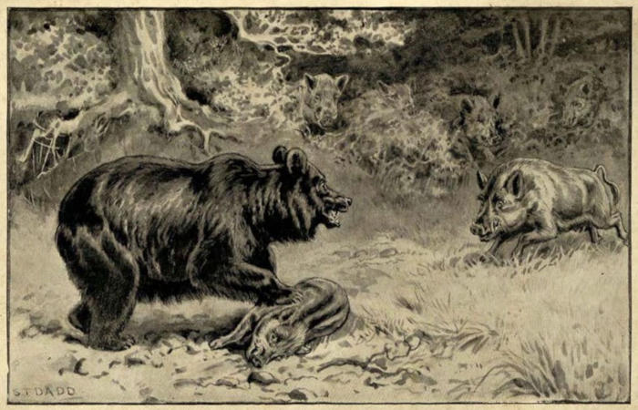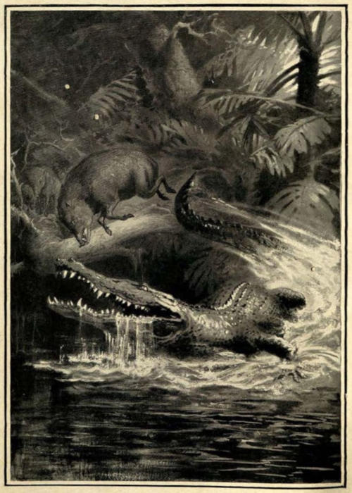 The peccary stood on the alligator’s tail, mistaking it for a tree trunk. In a moment the alligator stretched its tail round like a bow almost to its side: suddenly it let go, and whilst the peccary thus shot up was still in mid-air, it swung its terrible tail again, and knocked its now insensible prey almost into its own jaws.