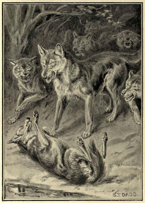In all probability, therefore, the two wolves, had the one that lay in ambush missed his spring, would have fought too, and this makes me the more inclined to believe a story which was told me—not, however, by an eye-witness—of wolves in America: from which it would appear that when the stratagem is carried out by more than a pair of associates, the duty of seizing the prey, if it devolves upon a single member of the band, may be a very dangerous one indeed. In the case alluded to, the[282] wolf that had to do this lay down by a small stream, at a place where it was fordable, and a wapiti was driven down upon it, through woods that fringed the bank, by the rest of the pack, amounting to a dozen or more. Knowing the ford, the wapiti made straight for it, and the wolf, springing up at the critical moment, either missed his mark or was shaken off by the powerful quarry. He was foiled, at any rate, and the wapiti, dashing into the water, gained the opposite bank and got clean away. Hardly had he disappeared when the pack, headed by a wolf of great size and strength—evidently the leader—came up, and now a most remarkable and, withal, tragic scene was enacted. The wolf that had failed flung itself on its back, and whining in the most pitiful way, appeared to bespeak the mercy of its incensed fellows, and especially of the grim-looking leader, whose action in the matter all seemed to await expectantly. For a moment or two—during which the whines and cries of the wretched criminal rose to an agony—the latter seemed to waver, but ferocity, or long-established custom, carried the day. He sprang forward to execute justice, and his example being instantly followed by the rest of the pack, the poor penitent was quickly torn to pieces and devoured on the spot. I cannot, as I say, vouch for this story, as I have not read or heard the original account of the person who is supposed to have witnessed the incident, but it tallies very curiously with the other two, both of which are authentic.