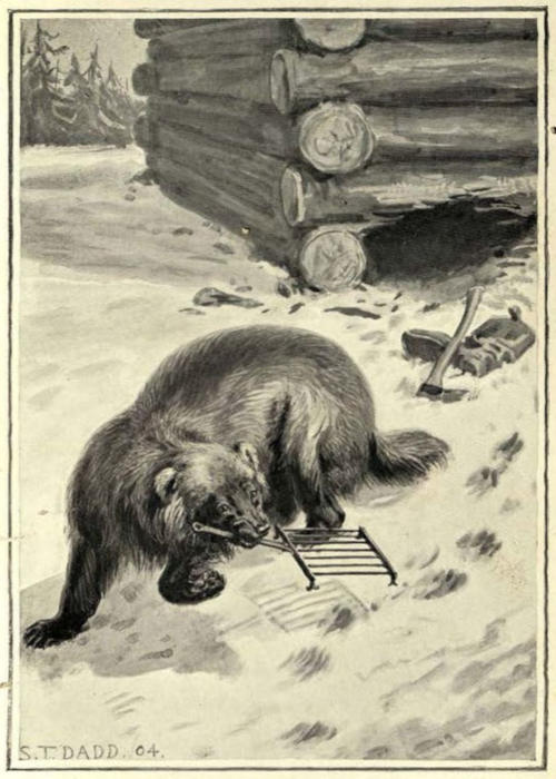 The wolverine comes to one of these little wigwams, and knows exactly what it means. There is something inside to be got, and a door to walk in by. That something[303] he means to have, but he is not going in by the door. He knows what would happen if he did. That is one of man’s horrible treacheries—pretending to be kind and nice to animals, but meaning to destroy them all the while. It is a trap, and the way to get the better of a trap is never to do what it asks you to do, or, at least, not in the way that it asks you to do it. So, being asked to go in by the door, the wolverine pulls out some of the poles at the other end, and goes in that way, taking the bait from behind. Having done this, he generally proceeds to show his contempt of the whole thing, and especially, perhaps, of the man who thought he could take him in, by destroying the trap in toto, scattering the poles all about, and then going off to do the same with the next. In this way the whole line of traps are treated one after another, and if a marten has been caught in any of them, the wolverine eats as much as he wants and hides the rest—for he is very fond of taking things away and hiding them. One may imagine the rage of the trapper when he comes back to look at his traps. Either he must get rid of the wolverine in some way, or leave that part of the country altogether. To lie in wait with a gun, himself, would be a tedious business, and the chances are that the wolverine would either smell him or find out his whereabouts in some other way, and so take care not to come near. He determines to trap him, or at least to try to. Half a dozen traps of different sorts—acting upon different principles of destruction—he makes himself, with all the skill and ingenuity that his own cunning, sharpened by a lifelong experience, can suggest,[304] and he sets several steel ones as well. Every three or four days he comes to look at them, but always, if the wolverine has been there at all, he finds one of two things. Either the baits have been taken and the traps pulled to pieces, or else both trap and bait have been left severely alone. In this latter case the cunning animal has feared to touch them. There are his tracks all about, and in some places the marks of his body, where he has lain down and gazed intently at the things he was trying to understand. But he was not quite satisfied, had not entirely grasped the principle, not penetrated as deeply into the matter as, under the circumstances, he would like to do. Therefore he would not touch it. Until he saw clearly just what the idea was, the trapper must really excuse him: he would much rather leave it alone. As soon as he had discovered it, he might be relied upon—the bait was most attractive—but until then he preferred to go on with the marten-traps. They were quite simple: no difficulty at all about them. For, of course, all the while, the trapper, who cannot afford to lose time, and hopes every day to catch the wolverine, keeps setting his marten-traps as before.