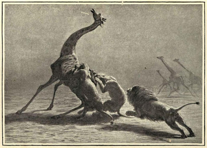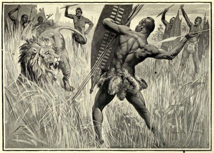 The hunters surrounded the lion shouting and singing, and the lion, confused by the noise and numbers, crouched and growled. The circle grew smaller and smaller until a single warrior rushed forward, the lion sprang upon him to be received on the point of his assegai, and was soon dispatched by the brave hunter and his comrades.