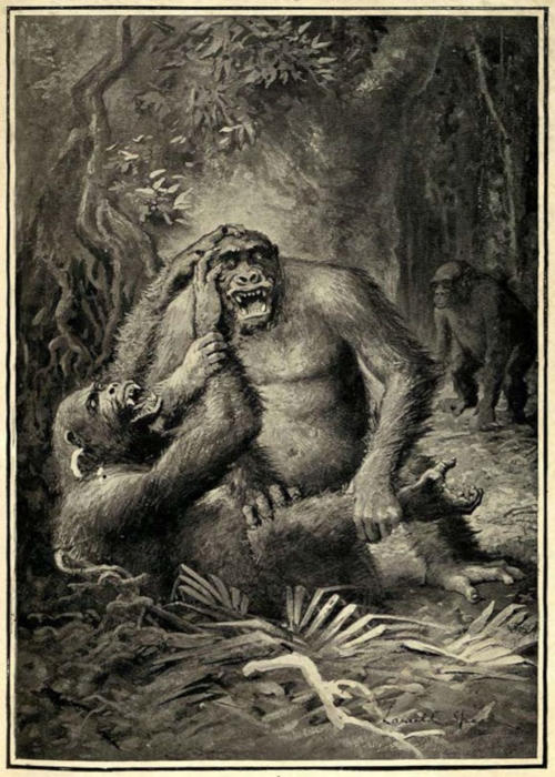 What a sight amidst these gloomy forests must be the contention in fierce rivalry of two full-grown male gorillas! We may imagine one—the more favoured suitor—sitting on the ground, his back, as is usual, against the trunk of a tree, and his arm flung carelessly about the object of his regard; the great fingers of the wonderfully human hand burying themselves in her fur. All at once the peaceful nature of the scene is rudely disturbed by the frowning presence of another male, whilst the silence is as suddenly broken by a terrific barking cry, passing into a long, loud, sullen, reverberating roar. The unwelcome comer has been, at first, upon all fours, but now he rears himself upon his short hind legs, and leaving the screen of heavy frondage that has hitherto partially concealed him, advances into the open space beneath this tropical trysting-tree.[320] As he does so, the female discreetly retires, whilst her spouse, or lover, assuming also the erect posture, comes forward to meet his rival. The two advance upon each other with ferocious mien, they roar alternately, or in unison, and beat, at intervals, with their doubled fists upon the vast convexity of their chests, producing in this way a deep, continuous, hollow sound, like the rolling of a muffled drum. As the distance between them decreases, the eyes of each seem to flash more fiercely, whilst the crest of hair upon the forehead is drawn rapidly up and down, with a twitching motion, by the angry contraction of the facial muscles. At length, and with a final roar, when separated by but a few paces, each drops upon its knuckles,[19] and springs, almost at the same time, upon the other. Were it a man that either encountered, he would instantly be stretched dead or dying upon the ground, but here terrific strength upon the one side is met by force as great upon the other, and the combat is as long and as dubious as it is furious and violent.