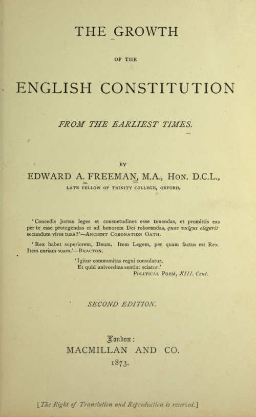 (33) The helpless way in which Blackstone himself wrote was perhaps pardonable in the dark times in which he lived. But it is really too bad when lawyer after lawyer, in successive editions, gives again to the world the astounding rubbish which in Blackstone’s day passed for early constitutional217 history. In Kerr’s edition of Blackstone, published in 1857, vol. i. p. 180, I find repeated, without alteration or comment, the monstrous assertion of Blackstone: “I believe there is no instance wherein the Crown of England has ever been asserted to be elective, except by the regicides at the infamous and unparalleled trial of King Charles I.” And in Serjeant Stephen’s Commentaries [1853], which are not a mere edition of Blackstone, but “New Commentaries partly founded on Blackstone,” the same words are found in vol. ii. p. 403, only leaving out the epithet “unparalleled,” which might with truth have been allowed to stay. In another place (iv. 481-2) we read how “after the Saxon government was firmly established in this island” came “the subdivision of the kingdom into a heptarchy, consisting of seven independent kingdoms, peopled and governed by different clans and colonies.” It seems then that in 1857 there were learned gentlemen who believed in a kingdom subdivided into a heptarchy. But when, in the next page, Blackstone tells us how Ælfred set about “to new-model the constitution, to rebuild it on a plan that should endure for ages,” and goes on in the usual style to attribute everything whatever to Ælfred personally, this seems to have been too much, and the editor gives an extract from Kemble by way of correction. One wonders that, if he had read Kemble at all, he had not learned a little more from him. It is amusing again when Blackstone tells us (i. 186, Kerr), “From Egbert to the death of Edmund Ironside, a period of above two hundred years, the Crown descended regularly through a succession of fifteen princes, without any deviation or interruption: save only”—all the cases where it did not descend regularly, according to Blackstone’s notions of regularity: But it is almost more amusing when Serjeant Stephen (ii. 410) throws Blackstone’s exceptions, which are at least historical facts, into a note, and gives us instead as218 his own exceptions, the statement, very doubtful and, if true, utterly irrelevant, that Æthelstan and Eadmund Ironside were illegitimate (see Norman Conquest, i. 669-673). We of course get the usual talk about the usurpations of Harold, Stephen, John, and Henry the Fourth, and about the rights of Eadgar and Arthur of Britanny. For the former we get a quotation from Matthew Paris, to whom it would have been more to the purpose to go for the great speech of Archbishop Hubert. The comments on the succession of John (i. 189, Kerr) are singularly amusing, but too long to quote.
