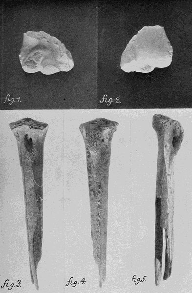 Fig. 1. Anconal aspect of the distal extremity of the right humerus of "Meleagris antiquus" of Marsh. Fig. 2. Palmar aspect of the same specimen shown in Fig. 1. Fig. 3. Anterior aspect of the proximal moiety of the left tarso-metatarsus of Meleagris celer of Marsh. Fig. 4. Posterior aspect of the same fragment of bone shown in Fig. 3. Fig. 5. Outer aspect of the same fragment of bone shown in Figs. 3 and 4. All figures natural size. Reproduced from photographs made direct from the specimens by Dr. R. W. Shufeldt.