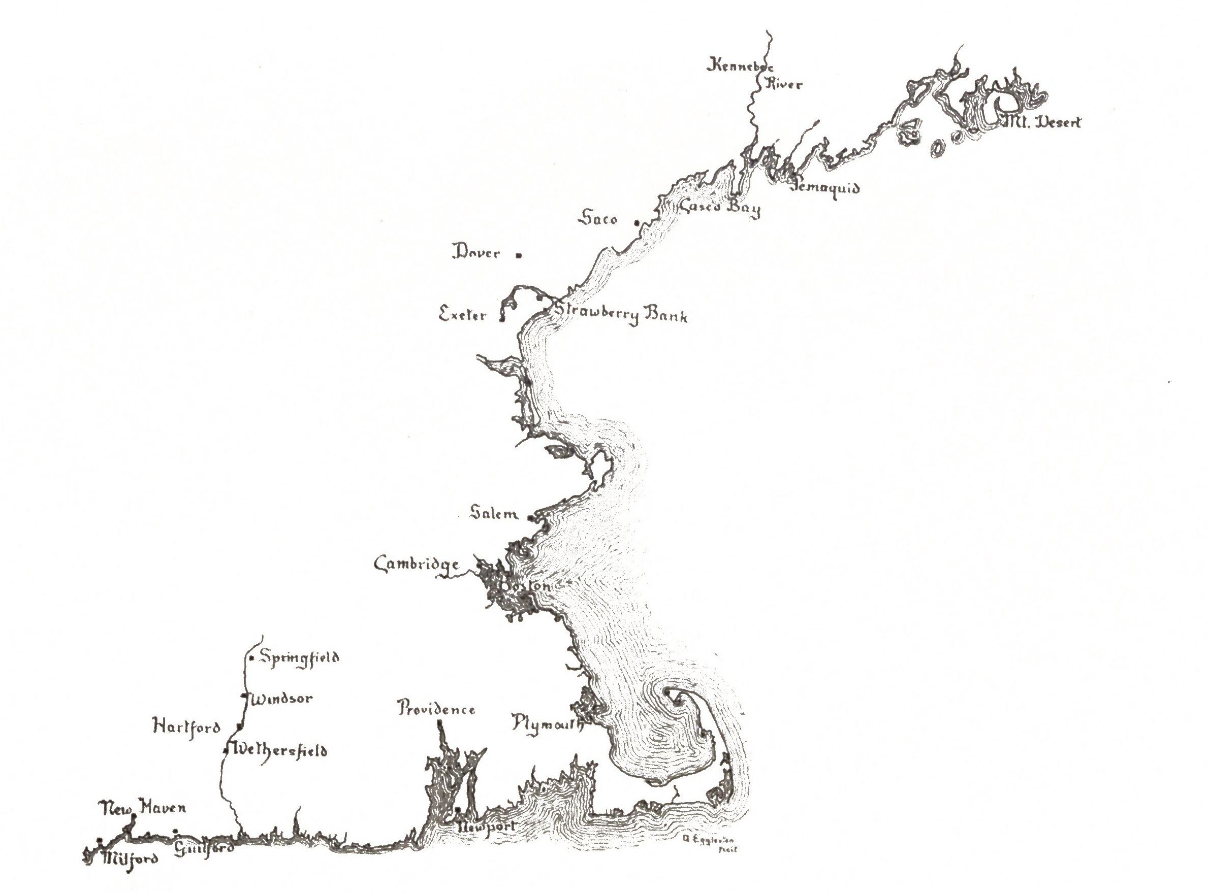 But the ever-mischievous South Sea delusion did not vanish when the period of colonization was reached. Ralph Lane's quest. Ralph Lane, the governor of Ralegh's first colony on Roanoke Island, having inquired perhaps for that western sea which Hakluyt had seen "on the mightie old mappe in parchment," understood the inventive savages to say that the Roanoke River sprang from a rock so near to a sea that the waves in storm often dashed into this fountain, making the river brackish for some distance below. That the story might be more interesting, they added that there was gold there, and that the walls of a town in that land were made of pearls. This is what the white men fancied the Indians said; but whatever they said was spoken in (p. 8) a tongue of which Lane's men had but the most scanty knowledge, if indeed it were not given mainly by signs. Note 3. Nothing dispirited by the extravagance of these tales, Lane and some of his men set out to immortalize and enrich themselves—like a company of children running after the pot of gold at the end of the rainbow. Lane's Account in Hakl. III. While the crafty Indians were plotting the destruction of the colonists left behind, the governor and his followers pursued their quest until they were obliged to eat their dogs, made palatable by seething with a dressing of sassafras leaves. They returned, half famished and wholly disappointed, just in time to rescue the colony from destruction. But faith is faith, and despite his severe experience Lane went back to England believing that the Roanoke rose near to the Bay of Mexico "that openeth out into the South Sea." The map which the colonists brought with them when they abandoned the country in 1586 handed down the delusion, in another form, by showing a strait leading from the neighborhood of Port Royal into a body of water to the westward. Note 4.