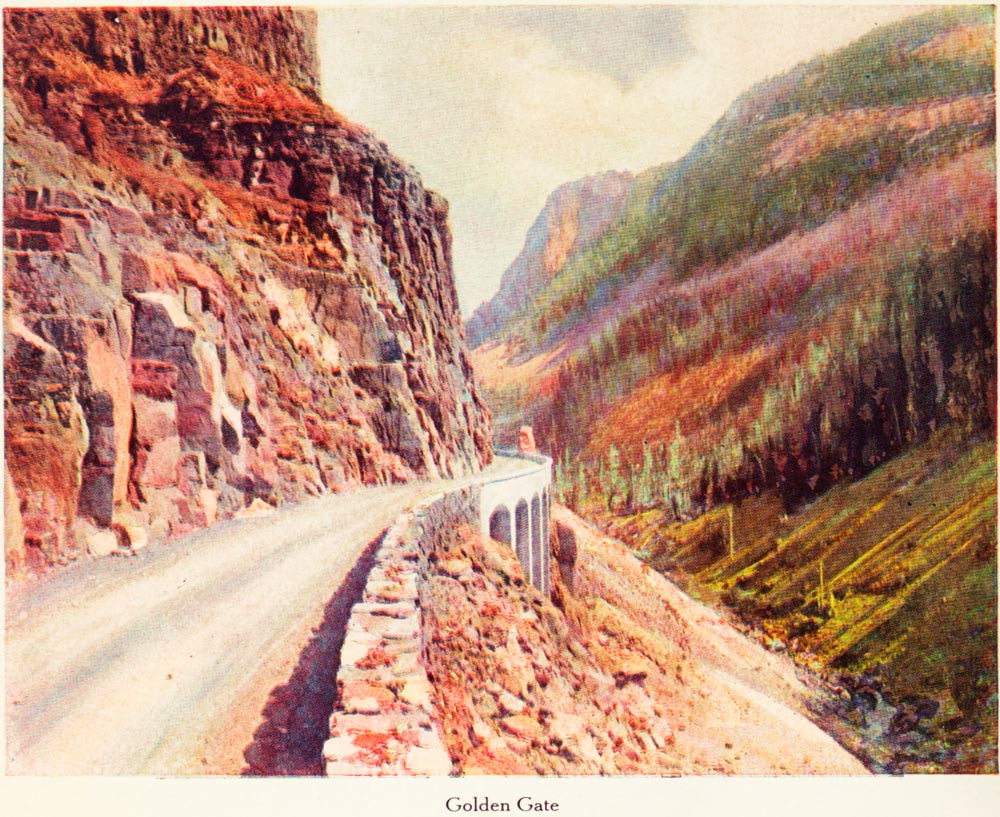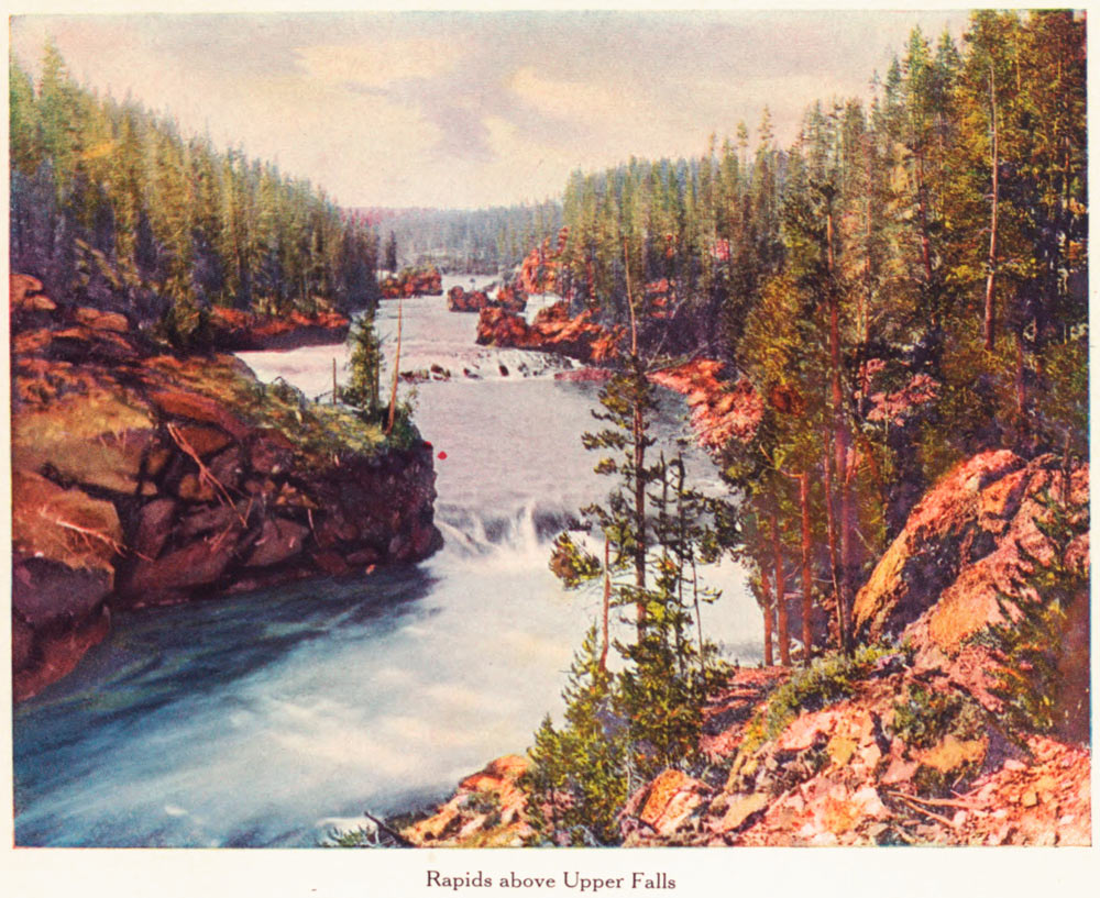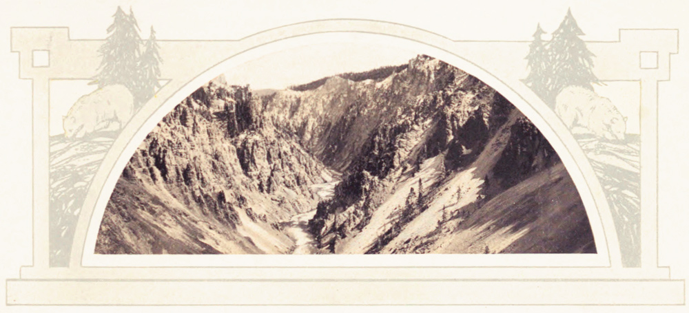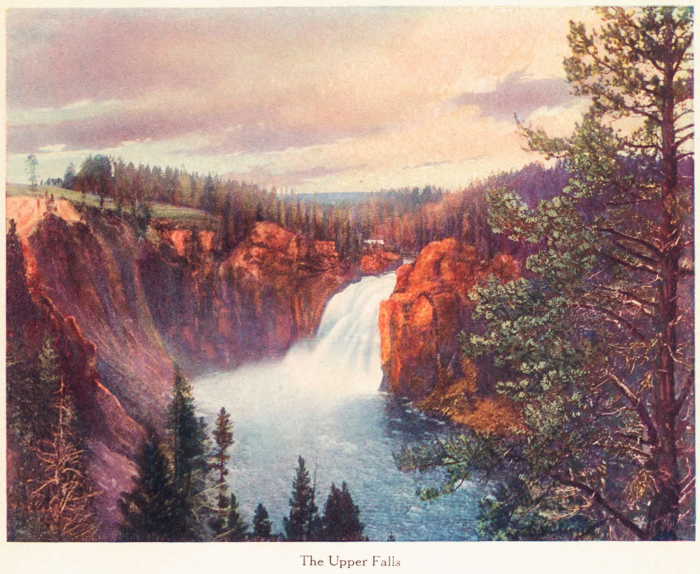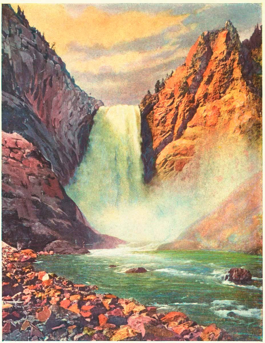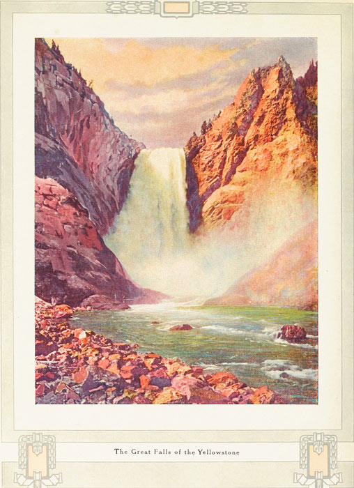 The Canyon and Falls of the Yellowstone beggar description. They are twin wonders in a Wonderland. Is there any other gorge as gorgeous as that Canyon? With such gaiety of coloring—with such delicate and lovely shades of yellows and reds, purples and pinks, greens and crimsons, all commingling in harmony from the green-fringed brink, down, down the craggy sides into sombre depths where the writhing, gleaming ribbon of river thousands of feet below, plunges along on its winding way to the sea?