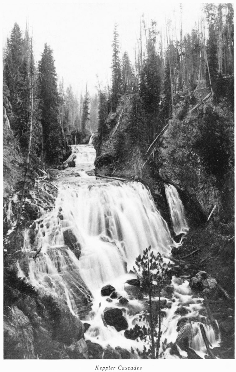 The waters are of such extraordinary transparency that the eye can only guess at their depth. They are held steaming and pulsating in great over-hanging bowls, from which they gently flow down over the stony cataracts, carving and decorating as they go. Jupiter and Pulpit Terraces are the master-pieces of Nature here; but there are hundreds of other curious and beautiful things to see. The drive to and from Norris is alive with interest. It leads through the Golden Gate, and on the way can be seen Obsidian Cliff, Roaring Mountain, Beaver and Twin Lakes and other attractive and curious features of topography.