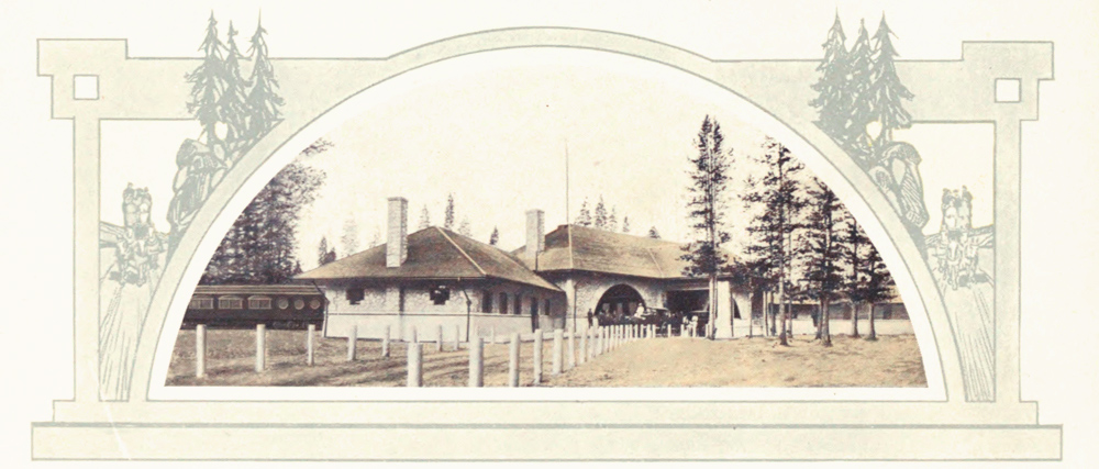 Old Faithful Inn looks out upon a great steaming, spouting field, and has its namesake—the glory of all the geysers—almost at its doors. So near, indeed, is it, that all the night through, at intervals of seventy minutes, can be heard the old monster in eruption.