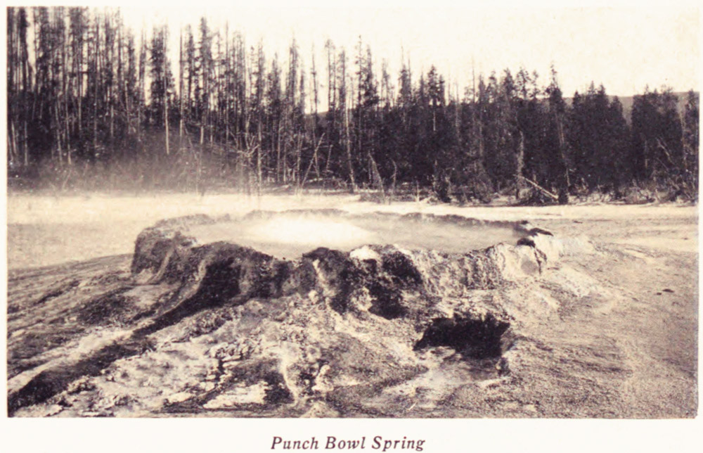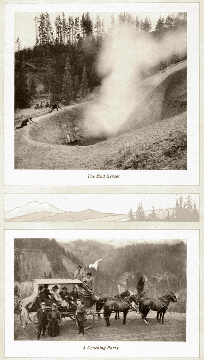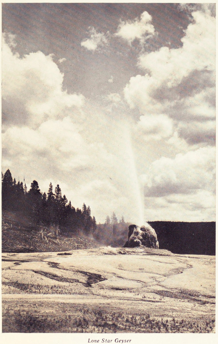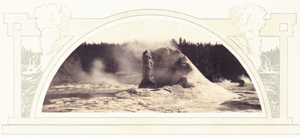 One blubbers and gurgles and grumbles awhile, and then with an angry roar lifts a great column of mud into the air. Another steams and growls through an orifice hundreds of feet wide in seeming angry spite that years ago it blew out its throat and ceased to gush forever. [A] But the geysers that most attract are the regular-timed spouting wonders—the Giant and Giantess, Old Faithful, the Grand, the Fountain, the Castle and others whose names mark the geography of the Park.
