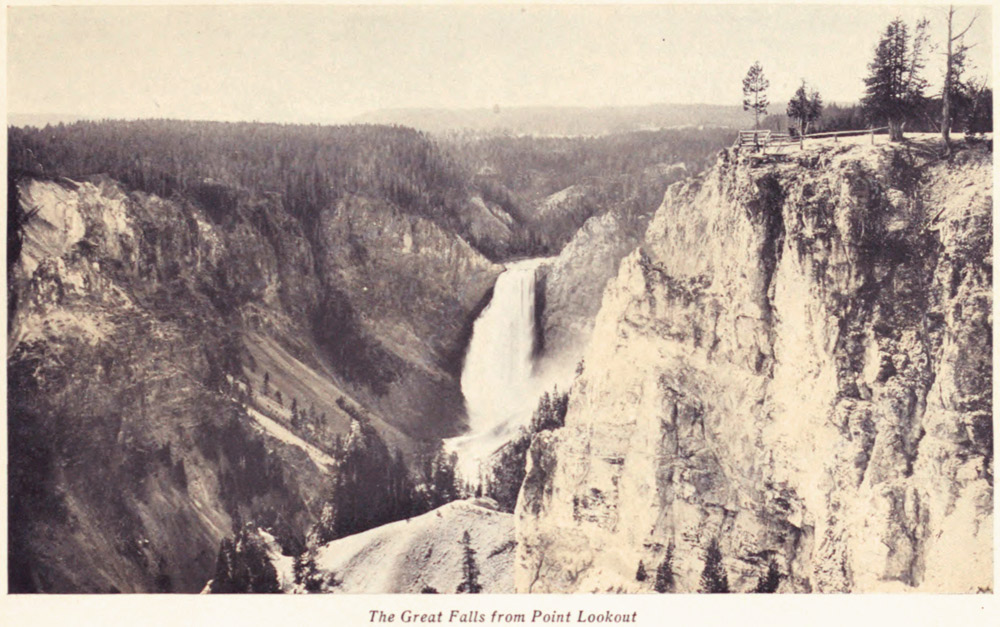See all this as thousands have and thousands will from "Inspiration Point"—a rocky balcony over the gorge, with the eagle's nests below you—or from "Artist's Point" on the other side, where Moran transferred the glories of canyon and falls to canvas; or see it from any of the other places where tourists love to linger and look, and you will see the most tremendous, stupendous, alluring and altogether splendid spectacle that Nature ever spread out for the wonder, amazement and delight of mortal eyes.