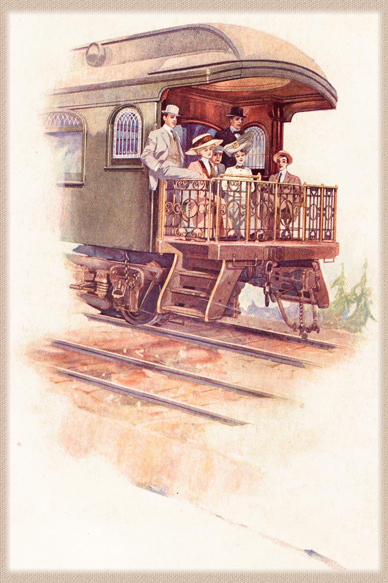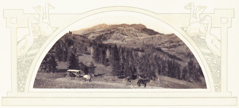 A good half of the pleasures of the tour is found in the coaching. To watch for the coming of the stage at the door of the Inn where the baggage is piled, and the porters and bell boys stand expectant—to hear the clatter of the wheels, the sound of hoofs, and to see the gaily harnessed horses in conscious pride swing the coach gracefully under the Porte Cochere—to be wheeled over the winding, dustless roads at ten miles an hour behind prancing leaders and wheelers—to be garbed as you please without thought of style or detail—to breathe air distilled among the fragrant pines—to be touched by breezes that fan your cheek and dishevel your hair—to be free from all care and abandon yourself to the delights that come with the everchanging scenes that panoramic Nature is constantly unfolding to your gaze—is to experience an exhilaration never to be found among the busy haunts of men.