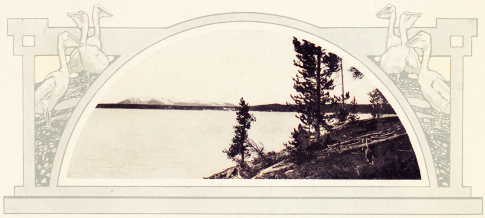 As a whole, the scenery of the Park is restful and satisfying. What it lacks in the stupendous it makes up in softness of coloring and the gentle undulations that lead gradually to the massive mountains. The green of the pines, lightened and darkened here and there with the shades of different species, is everywhere. The waters of the rivers are dimmed by the shadows; the cascades have a glimmer and sparkle quite their own, and now and then peep out in the sweeps of the distance, little lakes that shimmer in the sun. Vagrant clouds of steam, signs of the geysers and boiling springs, are seen all over the landscape, especially in the early morning when a little of the night frost still lingers in the air. Many grotesque shapes are taken on by the rocks, and there is hardly a spring or pool that does not suggest its name by its form. From the Lake Hotel can be seen facing skyward, the profile of a human face so perfect it has long been called "The Sleeping Giant." Yellowstone Lake is a marvel of beauty; the dense forest comes down to its shores, little dots of islands sprinkle its surface, its waters are crystal clear away into the deep, and under the kiss of the sun the face of the sea takes on a glory altogether splendid.