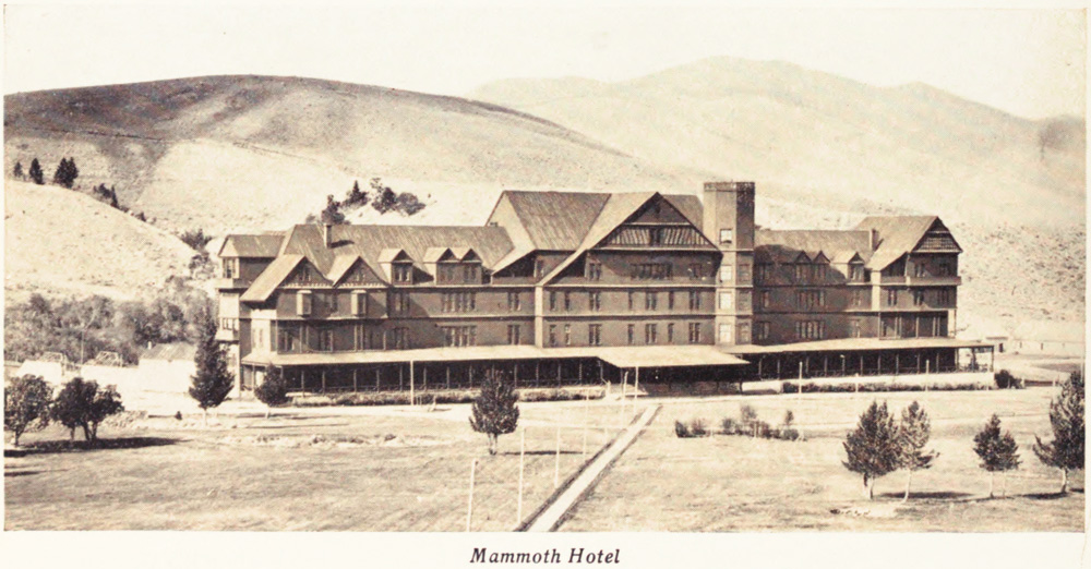 The great inn at Mammoth has in its foreground, three hundred feet high, the wonderful, many-colored, and beautifully-formed Hot Springs Terraces which belong in the list of the water-made wonders of the Park.