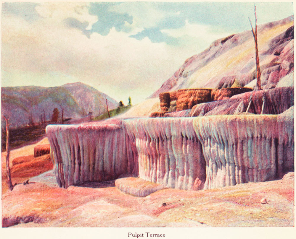The structural features are the Mammoth Hot Springs Hotel and the garrison of Fort Yellowstone, around which, and in the vicinity of the springs, the landscape gardener has produced many beautiful effects. Here are found the most remarkable terrace-building hot springs in the world. The formation is calcareous, and the deposition by the waters has built up through the centuries cataracts in stone of indescribable beauty through which the paints from the earth have been mingled and blended with a vividness of coloring and a perfection of shading that none but the Master's hand could work.