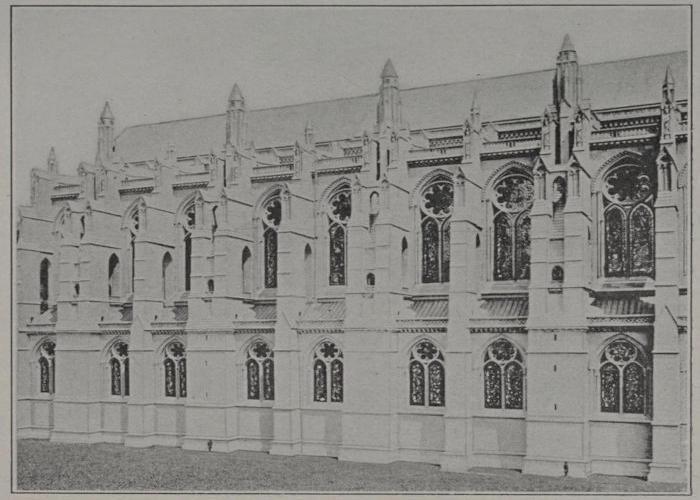 The archivolt outside of the tympanum is composed of three ranges of Gothic niches in the voussoirs, containing 36 little figures in the round. The outer range represents 14 ancient and modern Apostles of Christianity as follows, beginning at the lowest figure on the left-hand side and reading upward to the center, and thence downward to the lowest right-hand figure: (1) Count Zinzendorf, 1700-1760, German reformer, founder of Moravian Brethren, missionary to American Indians; (2) St. Boniface, 680-755, Apostle of Germany; (3) St. Francis Xavier, 1506-1552, Apostle of the Indies, one of the founders of the Society of Jesus; (4) St. Denis, 3d century, Apostle of the Gauls, Patron Saint of France; (5) St. Olaf, 995-1030, Patron Saint and King of Norway; (6) St. Augustine, died 604, missionary to Britain, first Archbishop of Canterbury; (7) Innocent of Moscow, 1797-1879, Apostle of Alaska and Kamchatka, Archbishop of Moscow; (8) St. Patrick, circ. 372-460, Apostle and Patron Saint of Ireland; (9) John Eliot, 1604-1690, Apostle of American Indians, translator of Bible into Indian language; (10) St. Willibrod, 658-739, Apostle of the Frisians, Archbishop of Utrecht; (11) St. Cyril, 827-869, Apostle of the Slavs, inventor of the Cyrillic alphabet; (12) David Livingstone, 1813-1873, British explorer and missionary in Africa; (13) St. Columba, 521-597, Apostle of Caledonia; (14) Charles George[113] Gordon, “Gordon Pasha,” 1833-1885, British General, promoter of Christianity in China and Egypt. The 12 figures in the middle range represent the Arts and Sciences. In the same order they are: (1) Natural Science, man with microscope; (2) Sculpture, man with mallet and chisel; (3) Medicine, man with book and skull; (4) Literature, woman reading a book; (5) Chemistry, woman holding aloft a retort; (6) Industrial Art, man with vase; (7) Painting, man with palette; (8) Astronomy, man with globe; (9) Mathematics, man wearing spectacles and gown, holding cone and truncated pyramid; (10) Physics, woman with telephone; (11) Music, man with violoncello; (12) Architecture, man[50] holding model of building. The 10 figures in the innermost range represent the Crafts and Industries, as follows: (1) Bookbinding, man making a book; (2) Agriculture, man sowing seed; (3) Metal Industry, man pouring molten metal from ladle; (4) Textile Industry, woman with distaff and shuttle; (5) Navigation, sailor holding telescope with rope at feet; (6) Building, man laying brick; (7) Engineering, man holding tape measure; (8) Fishing, sailor with seine; (9) Mining, man with pickaxe and miner’s cap; (10) Shoemaking, cobbler at his last. Below these, in niches in the splays and central pilaster of the door-way, are 7 larger figures representing Seven Famous Christian Rulers who have carried out the injunction in the tympanum, as follows, (left to right): (1) Emperor Constantine, once ruler of the Roman World and founder of Constantinople, who proclaimed religious toleration and presided over the council which adopted the Nicene Creed; (2) Charlemagne, King of the Franks, Emperor of the revived western Roman empire, who introduced Christianity into conquered countries, maintained[114] popular assemblies, and promoted science, art and letters; (3) Alexis, one of the ablest Emperors of Byzantium and friend of the Crusaders; (4, in center) George Washington, to whose character as Christian soldier, statesman and first President of the United States, attaches local interest from the fact that he commanded the American troops in the Battle of Harlem Heights which was fought partly on the ground occupied by the Cathedral Close; (5) Gustavus Adolphus, King of Sweden, one of the greatest generals, who, with his army in Germany, saved the cause of Protestantism in the Thirty Years War; (6) St. Louis, King of France, the most distinguished monarch of his age, who was noted for his piety, justice and mercy, and who died on a Crusade; and (7) Alfred the Great, King of Wessex, who bore the brunt of the Danish invasions and was a promoter of education and Christianity. The sculptures are by John Evans & Co. of Boston. The Interior decoration of the high roof and open timbers of the truss-work in polychrome is typical of the Middle Ages and the wood panelling is a reminder of 15th century work. The latter is by Messrs. Wm. F. Ross & Co., of Cambridge, Mass. The grisaille windows are by Mr. Charles J. Connick of Boston. The main hall, which seats 800 on the floor and 400 in the gallery, has a large pipe organ built by the Ernest M. Skinner Co. of Boston. The Undercroft (basement) is equipped for use as a refectory. The building cost about $350,000. In the main vestibule, over the outer door-way, is this inscription: