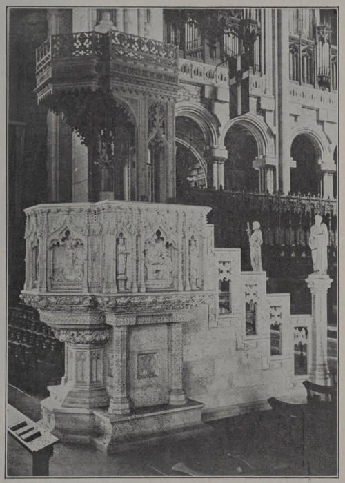 The Open Air Pulpit (F. on plan) standing in the midst of the Cathedral Close, is in the form of an[115] open-work Gothic spire 40 feet high, built of Daytona stone. On its four sides are the usual symbols of the four Evangelists. The pulpit was designed by Messrs. Howells and Stokes and was presented by Miss Olivia Phelps Stokes in memory of her sister Miss Caroline Phelps Stokes. It was suggested by the outdoor services held here before the Choir and Crossing were ready, and by the open air pulpit attached to the cathedral church at Perugia.