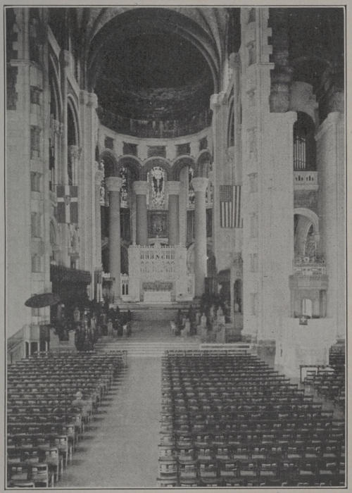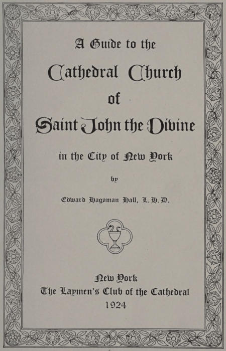 This Guide to the Cathedral of Saint John the Divine purposely departs from the conventional guide book in several respects. The Cathedral of St. John the Divine is not centuries old like those in Europe, but is in the building; and it has seemed appropriate in the first place to express something of its Spirit before describing the details of its Fabric. In the next place, the great majority of visitors to the Cathedral are strangers, people of other denominations, and, on account of its proximity to one of the leading American universities, students. For this reason, an effort has been made to avoid technical terms as far as possible; to explain the significance of much symbolism not generally understood; and to insert Bible references freely for the benefit of those who wish to study further the meaning of the scenes and objects described. Lest some of the explanations—as, for instance, that in regard to the probable date of the completion of the Cathedral—be deemed superfluous, it may be said that this, as well as nearly every other statement in the following pages, is an answer to some question asked among the thousand and one interrogations which manifest popular interest in the Cathedral’s growth. In response to more than one request, “some of those little things that one would tell informally in explaining the Cathedral to a friend” have been included. Among these are the incident of the blind woman who “saw” the Cathedral, which possesses[6] a touching human interest; and the story of the Dove of Peace, in which may be seen the beginning of the traditional lore that will grow up around the Cathedral as the years roll on.