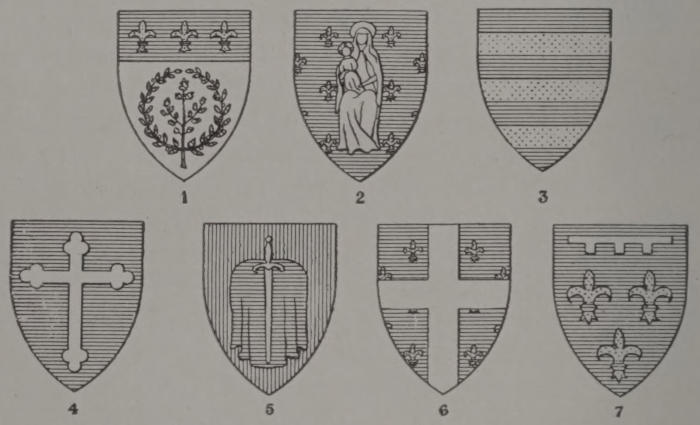 [39] Strictly, the arms of the Archbishop of Rheims are: On a blue field sprinkled with golden fleurs de lis, a silver cross over all.