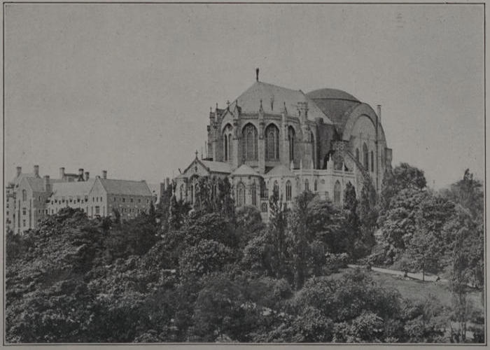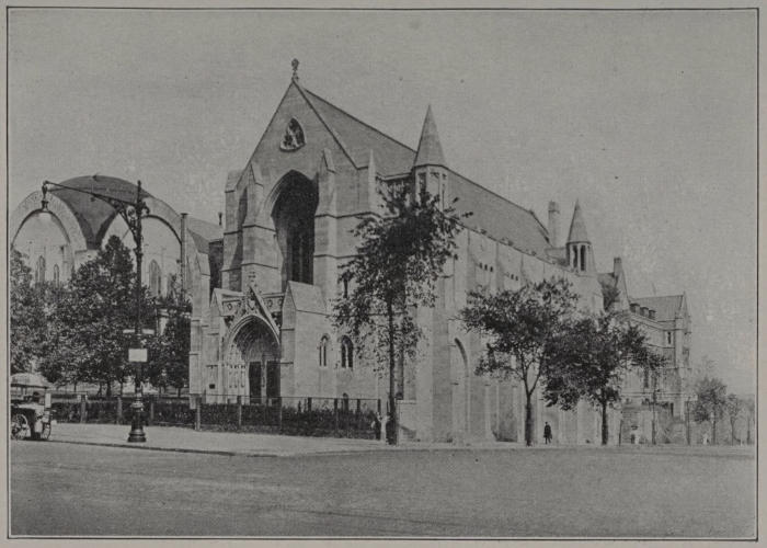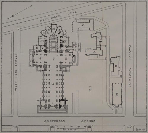 The Choir School (C. on Plan) has a special interest for everyone who goes to the Cathedral, for here are educated and trained the boys who sing in the Cathedral services. The school was founded by Bishop H. C. Potter in 1901 and was formerly located in the Old Synod House. The present building, erected in 1912 and built of the same kind of stone as the Bishop’s House and Deanery, is in the English Collegiate Gothic style of architecture; is three stories high, and has extreme outside dimensions of 83 by 150 feet. Messrs. Walter Cook and Winthrop A. Welch were the architects. The building contains offices, a general school room which is equipped with apparatus for both stereopticon and moving pictures, a choir rehearsal room with stalls, individual rooms for vocal and instrumental practice, a fine large common room with open fire-place for reading and social intercourse, dining room, kitchen, dormitories, a big gymnasium, a sick room to which a boy is transferred upon the first sign of any illness, etc. Accommodations are provided for 40 resident scholars and 20 day scholars. Their musical training is under the personal direction of the organist and Master of the Choristers, and their general education under the direction of the Head Master and staff of under-masters. A sympathetic House Mother looks out for the personal wants of the boys and directs the domestic service; and competent physicians and trained nurses are in attendance when necessary. Boys are admitted to the school at the age of 9 and remain until their[107] voices change, which is usually between the ages of 13 and 14. They come from all parts of the United States and possessions, two boys recently having come from Alaska. An applicant is first received on probation, and if he manifests a good character and disposition, and gives promise of a good voice, he is accepted as a chorister. Until they become full choristers, vested with cassock and cotta, probationers sit in separate choir stalls in the Cathedral services and wear only their black student gowns. During their residence at the school, the boys are under strict but gentle discipline and have the finest education and musical training that can be given them. Their board, education and musical training are free, in return for which they give their services as choristers. When they leave the school, they are followed by the interest of the Cathedral organizations which endeavor to secure scholarships for their higher education. The men of the choir, of whom there are about 20, do not reside at the Choir School. The usual number of choristers, men and boys, in the Cathedral services is about 60, except during the summer vacation when the number is somewhat reduced. There is probably no finer choir school in the world, and the Cathedral music is the highest expression of this form of musical art in this country.