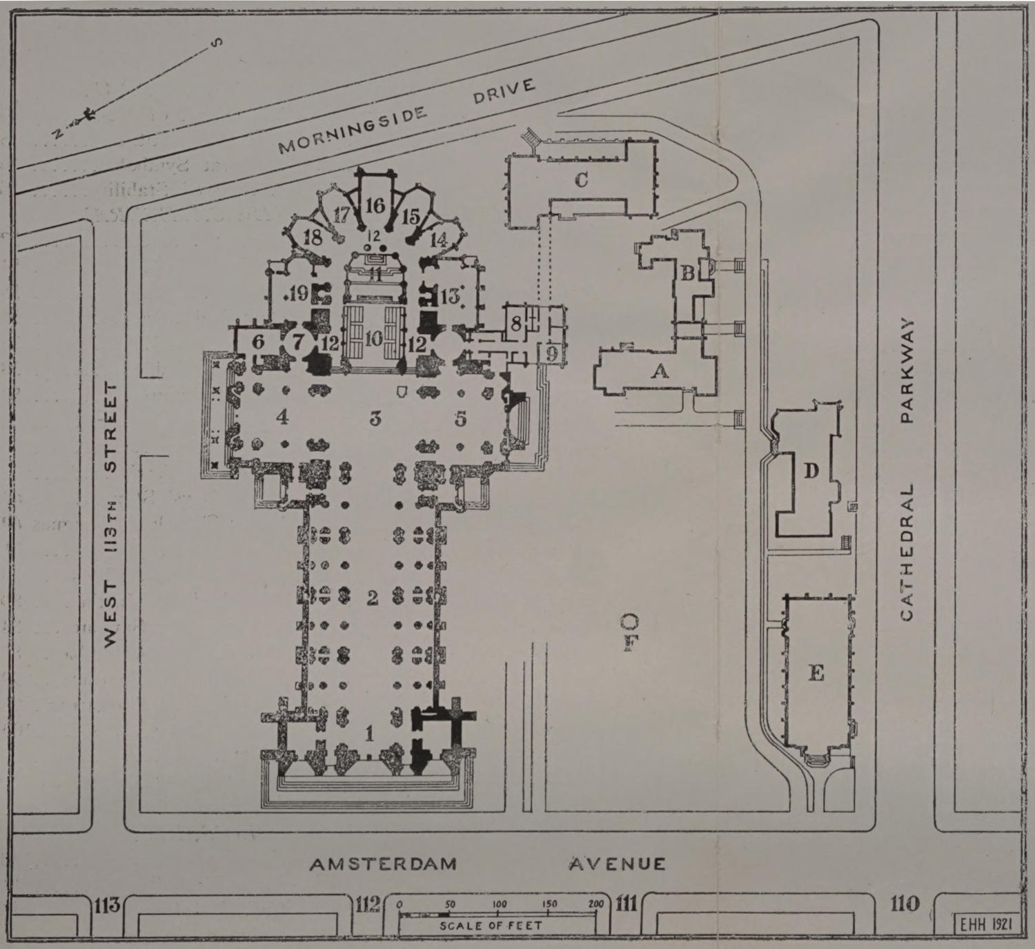 The Bishop’s House (A. on plan) is in French Gothic architecture of the chateau type, with lofty roof and high dormer windows, and is built of Germantown micaceous schist. It is designed to be connected with the Cathedral by cloisters, and is connected with the Deanery by a vaulted porch above which is to be built the Bishop’s private chapel. The extreme outside dimensions of the Bishop’s House are 77 by 126 feet, including the porch. The architects were Messrs. Cram & Ferguson.[49] The occupants of the house have been Bishop Greer from the time of its opening in 1914 until his death May 19, 1919; Bishop Burch from his installation October 28, 1919, until his death December 20, 1920; and Bishop Manning since his consecration on May 11, 1921.