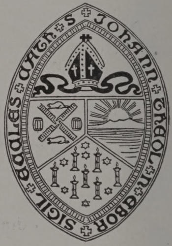 The Cathedral Ushers are members of the Laymen’s Club as stipulated in a resolution of the Cathedral Trustees passed April 25, 1911, and are designated from week to week by the Canon Sacrist. The badge of the Ushers is a vesica-shaped[51] gold medallion, having in the center an episcopal mitre, surrounded by the legend “Ecclesia Cathedralis S. Johannis Theologi;” suspended by a purple ribbon from a gold bar bearing the word “Usher.”