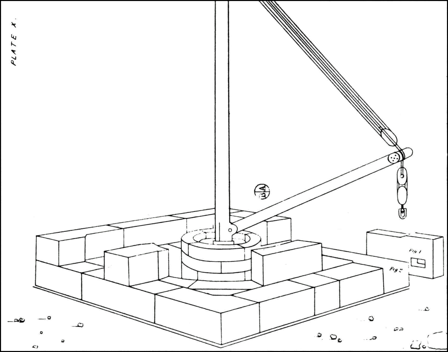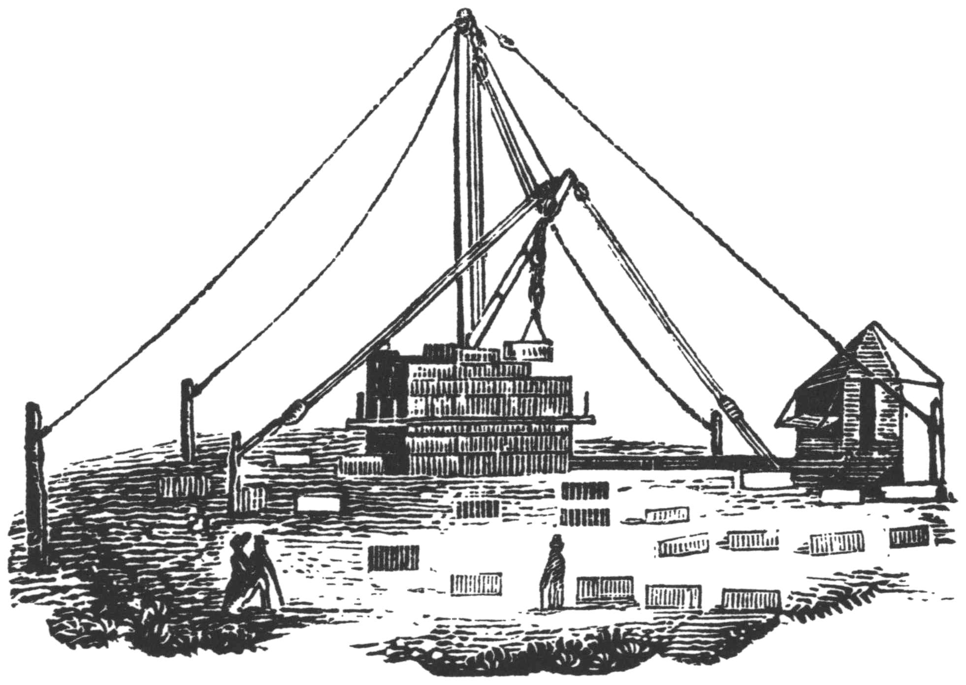 Every four courses of the wall stones (about 11 feet) the derrick was raised, perhaps by unshipping the boom and using it as a lesser mast to raise the mast proper. Square timber sticks were then beginning to be used for staging, instead of the round trunks of small trees and saplings previously used. A sketch of the monument shows a squared timber stage for pointing the joints. Such a stage could be much more easily erected, and was more reliable than the round sticks, tied at the joints by cords.