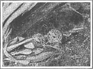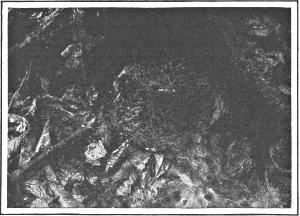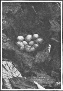 In my notebooks the nest of the ruffed grouse figures as a hollow in the ground, lined with dead leaves or pine needles. The eggs range from seven to twelve; in one case fifteen. The mother does not commonly cover them on leaving the nest; although a bird was once seen to do so by dropping straws and leaves on her back and then sliding out from under.