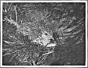 The little ones all come from the shell together, and are fully equipped to find their own living. They need the mother only as guard, defender, and shelter. When they pop out of the eggs they leave the nest forever, and thenceforth they are at home in Robin Hood’s barn, and sleep wherever weariness or night overtakes them. A little roving band of downy, brownie, striped chicks, they keep close together, running here and there, always hunting, picking insects from grass, ground, and foliage; while the mother, stalking behind, herds them along with soft and gentle calls, acting as rear guard, to give warning of any enemy that may be upon their trail, to lead the destroyer away if she can, to defend them with her life if she cannot, and to brood them beneath her maternal breast whenever they are wet, cold, tired, or sleepy. Wherever night finds them there they snuggle down to sleep, protected from cold and storm by her tireless devotion. Probably the little ones do not leave much scent; but the fox, raccoon, mink, weasel, dog, and cat may cross their trail at any moment, crows, owls, and hawks menace them; yet commonly about half of them escape all danger and grow and thrive while the summer waxes and wanes. They learn to fly by the end of the first week. Before they are half grown they leave the ground at night, and roost with the mother in the trees.