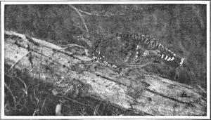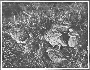 The drumming of a ruffed grouse is like the sound of a rattlesnake: only those who have heard it know what it is like. It seems to come from any part of the thicket or woods, like the voice of a ventriloquist. Sometimes it resembles distant thunder or the rumble of wheels. Early in spring the male steps cautiously out on a log, first making sure that no fox or weasel is hiding near. His rich chestnut hue, with purple or bronze on the ruffs, and white-barred tail, harmonizes beautifully with the shadows of the surrounding spruce thicket. Then he rises on tiptoe, and with wings held out a little way from the body begins his thump, thump, thump—faster and faster until it dies away in a mere rumbling. Hunters at one time supposed that this sound was made by the wings striking against the log or stump; but it is now known to be produced by rapid vibration of the quill feathers. Usually there are hen grouse nearby who sneak up through the leaves to watch his performance. He takes them all if he can find them, for the grouse cock prefers a harem; and they go about in a flock together. Day after day the drummer returns to his favorite log, until the warm weather comes on.