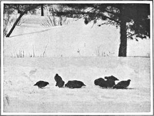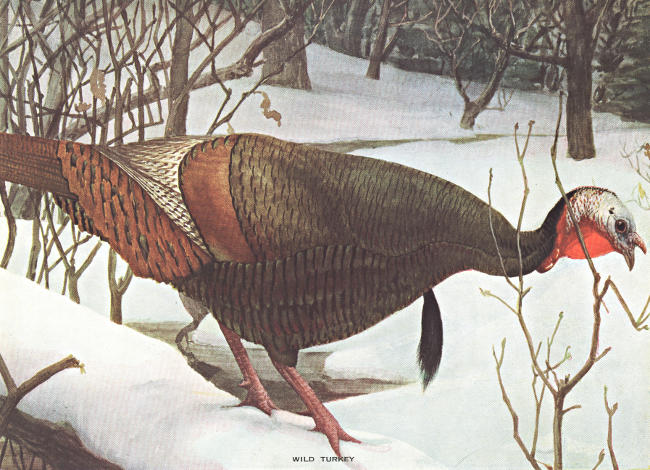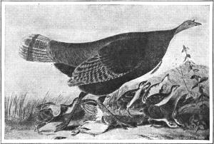 Wild birds are now rare. In the southern Adirondacks and even parts of the West, where there are still enough to tempt the hunter, they furnish excellent sport; for the old gobbler is a wise bird when traps are forbidden. The usual method of hunting is by tracks in the snow,—a difficult sport, requiring especial skill; for the turkey flies long distances if pursued. In the West it has been hunted on horseback with greyhound.