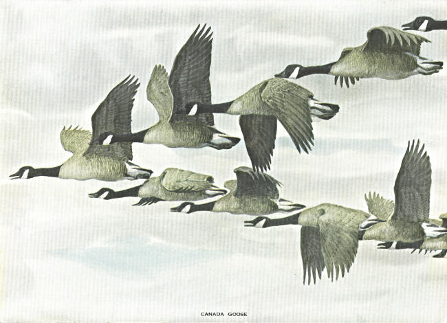 There is no more exhilarating sound in nature than the sonorous honking of wild geese. Who has not at some time in his life heard, far aloft, the well-known trumpet “Honk!” and the prompt answers all down the two lines as the V-shaped flock winged swiftly forward? Usually the geese fly in a broad, V-shaped line; but this is not constant, and one sometimes sees them flying in a long, whiplike curve. This seems to be when they are temporarily disturbed, as by some strong change in the air currents. But it seldom lasts long, as the birds soon rearrange themselves in their geometrical angle formation. In the raw, windy days at winter’s end, as the flocks fly north, the old gander’s cry is accepted as a guarantee of spring, and hailed with joy.