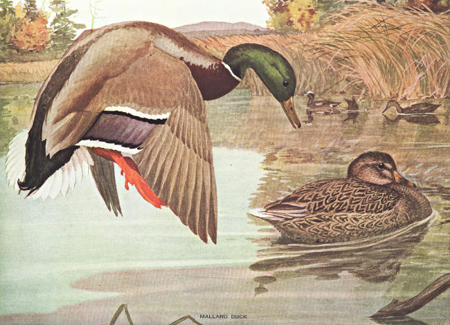 The mallard is wary and wise. It is one of the largest ducks; it is one of the handsomest; it is very strong on the wing, and highly intelligent. The drake, with his shining green head, mahogany breast, violet striped wings and pearl-gray body, is one of our most striking and beautiful ducks. The female is a very different looking bird. She is of a modest brown color, streaked with black.