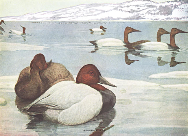 The canvasback, most famous of wild fowl, is a purely and exclusively American species, ranging during the year over practically the whole North American continent. But now this duck is little more than a bird of history. It has been almost exterminated by the gunners. Once the delight of the epicure, it promises soon to become a curiosity. Canvasbacks breed principally in the interior of British America and Alaska. They make their first migration southward during October. As they are a very hardy bird, many canvasbacks spend the winter in the northern states. But it is in the middle and southern states, particularly in the Chesapeake, that they congregate in greatest numbers.