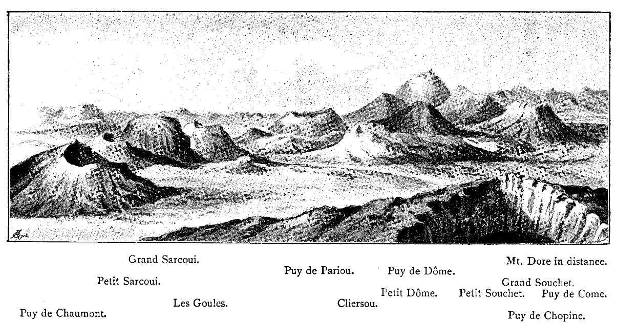Taking the Puy de Dôme, Petit Suchet, Cliersou, Grand Sarcoui in Auvergne, and the Mamelon in the Isle of Bourbon as illustrations, we have in all these cases a group of volcanic hills, dome-shaped and destitute of craters, the summits being rounded or slightly flattened. We also observe that the flanks rise more abruptly from their bases, and contrast in outline with the graceful curve of the crater cones. [Pg 17]The dome-shaped volcanoes are generally composed of felsitic matter, whether domite, trachyte, or andesite, which has been extruded in a molten or viscous condition from some orifice or fissure in the earth's crust, and being piled up and spreading outwards, necessarily assumes such a form as that of a dome, as has been shown by experiment on a small scale by Dr. E. Reyer, of Grätz.[5] The contrast between the two forms (those of the dome and the crater-cone) is exemplified in the case of the Grand Sarcoui and its neighbours. The former is composed of a species of trachyte; the latter of ashes and fragmental matter which have been blown out of their respective vents of eruption into the air, and piled up and around in a crateriform manner with sides of gradually diminishing slope outwards, thus giving rise to the characteristic volcanic curve. The two varieties here referred to, contrasting in form, composition, and colour of material, can be clearly recognised from the summit of the Puy de Dôme, which rises by a head and shoulders above its fellows, and thus affords an advantageous standpoint from which to compare the various forms of this remarkable group of volcanic mountains.