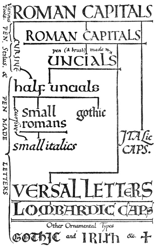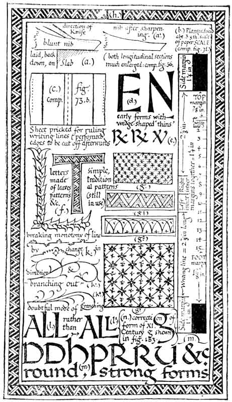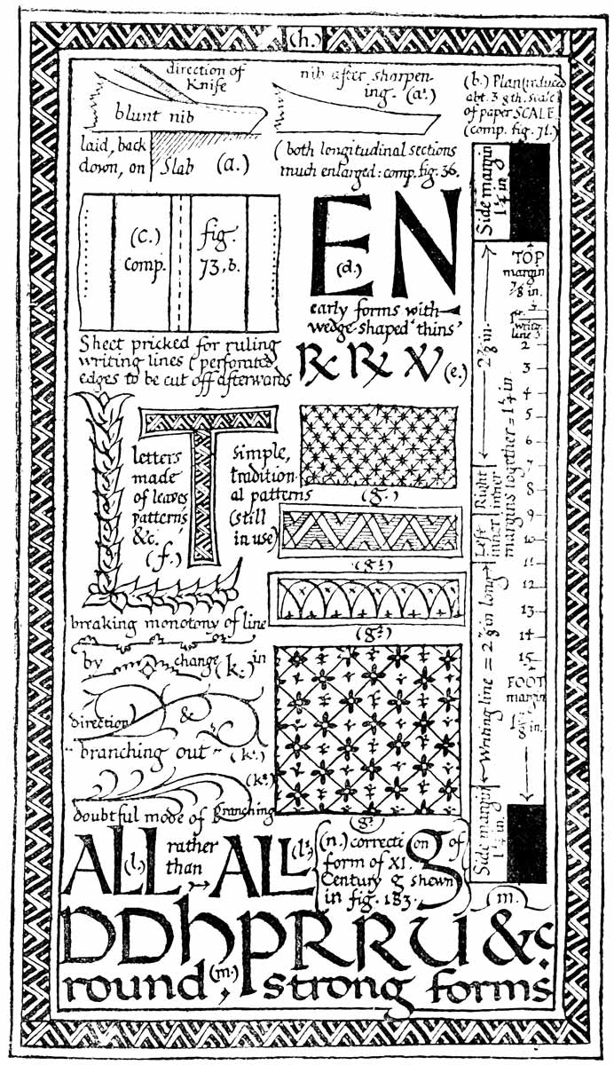 The arts of WRITING, ILLUMINATING, & LETTERING offer a wide field for the ingenious and careful craftsman and open the way to a number of delightful occupations. Beyond their many uses—some of which are referred to below—they have a very great educational value. This has long been recognized in the teaching of elementary design, and the practice of designing Alphabets and Inscriptions is now common in most Schools of Art. Much would be gained by substituting, generally, WRITING for designing, because writing being the medium by which nearly all our letters have been evolved from the Roman Capital (see p. 35), the use of the pen—essentially a letter-making tool—gives a practical insight into the construction of letters attainable in no other way. The most important use of letters is in the making of books, and the foundations of typography and book decoration may be mastered—as they were laid—by the planning, writing, and illuminating of MSS. in book form. Of this a modern printer (see also p. 368) says: