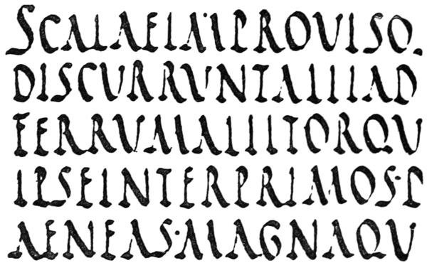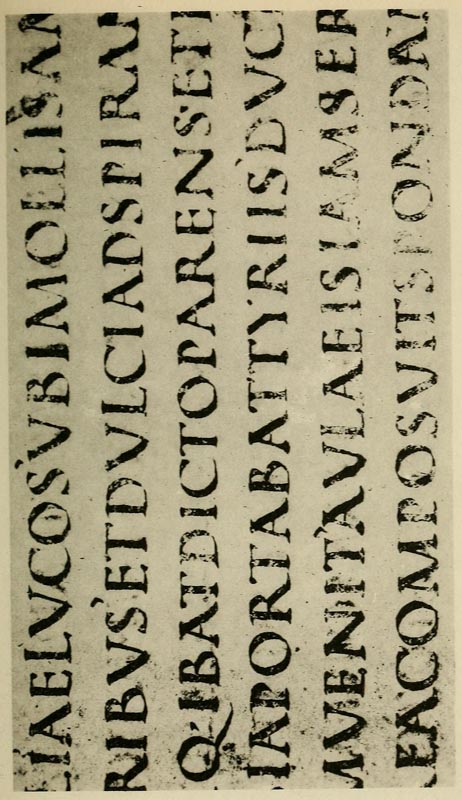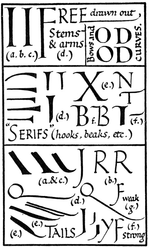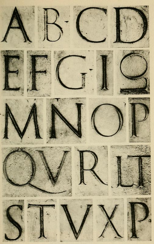 The curious assemblages of wedge-shaped indentations which make up Assyrian writing are a direct outcome of the clay cake, and the stylus used to imprint little marks on it. The forms of Chinese characters, it is evident, were made by quickly representing with a brush earlier pictorial signs. The Roman characters, which are our letters to-day, although their earlier forms have only come down to us cut in stone, must have been formed by incessant practice with a flat, stiff [p-x] brush, or some such tool. The disposition of the thicks and thins, and the exact shape of the curves, must have been settled by an instrument used rapidly; I suppose, indeed, that most of the great monumental inscriptions were designed in situ by a master writer, and only cut in by the mason, the cutting being merely a fixing, as it were, of the writing, and the cut inscriptions must always have been intended to be completed by painting.