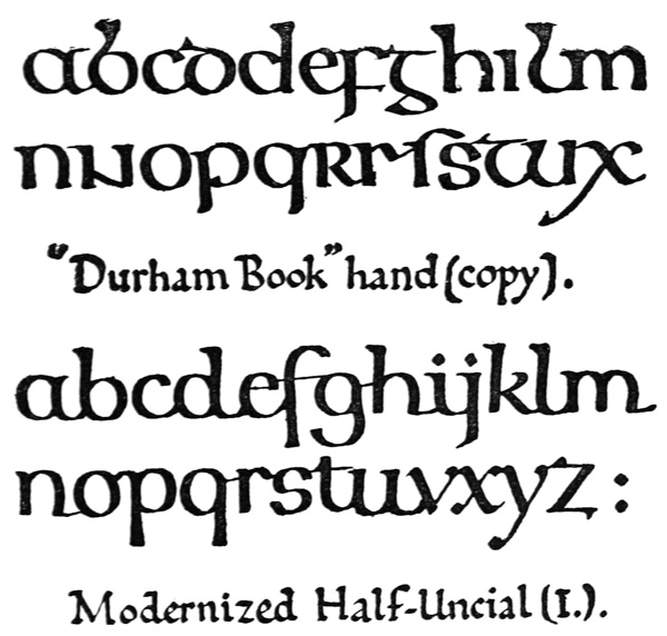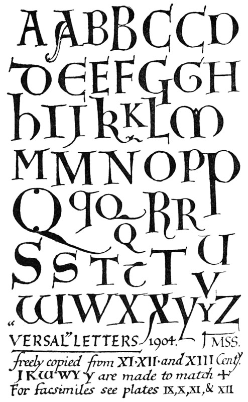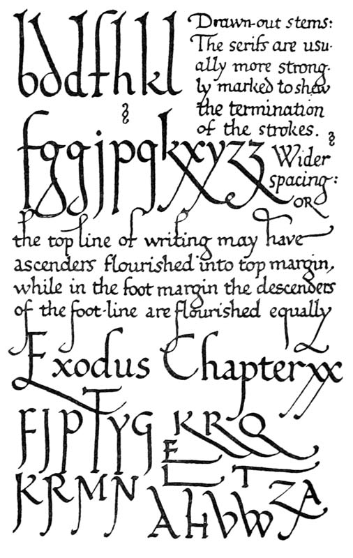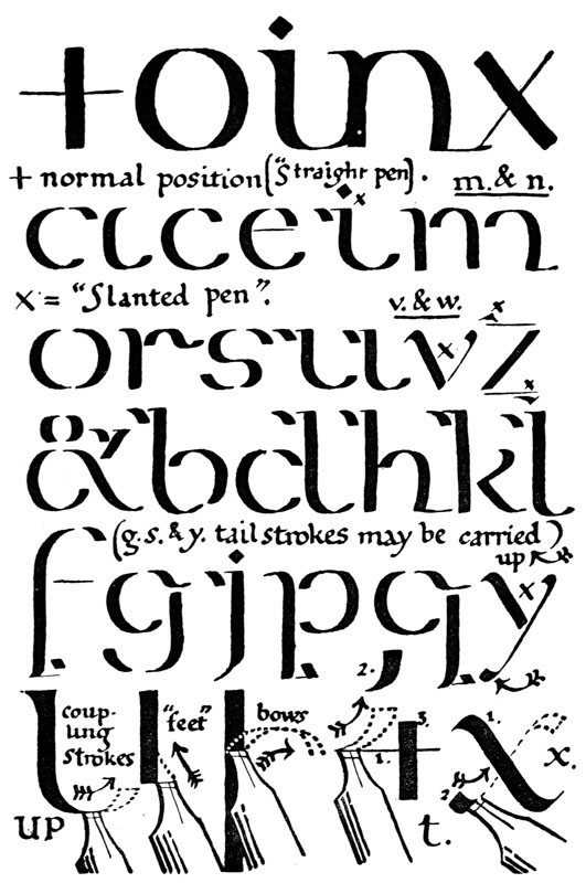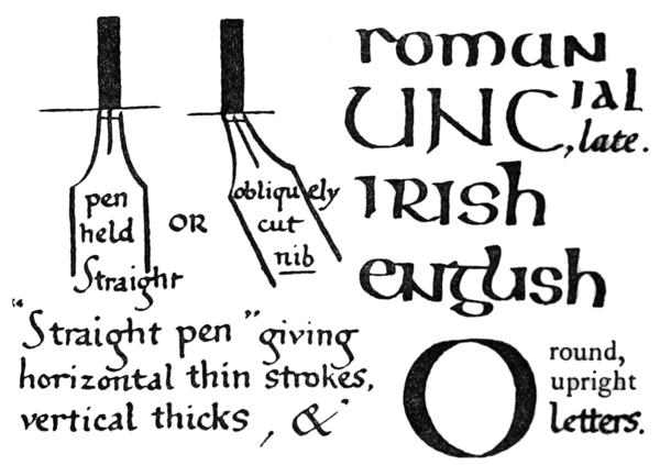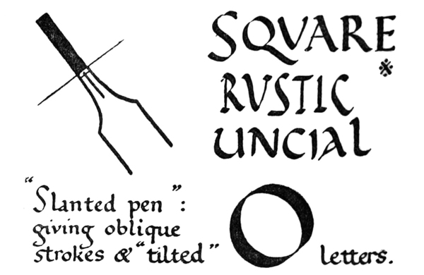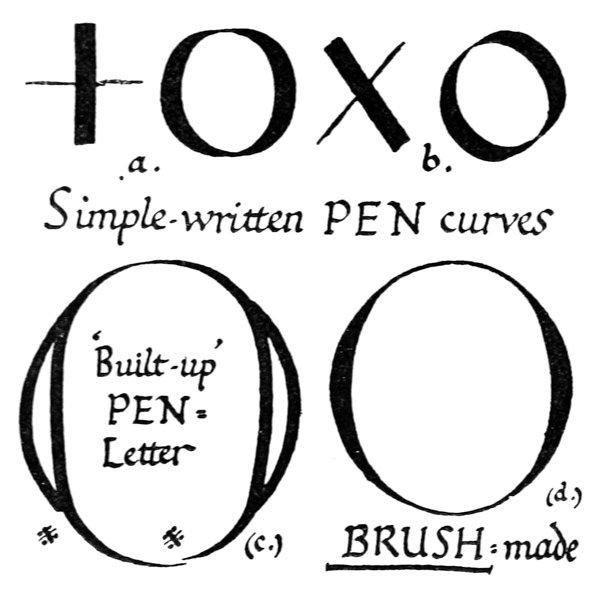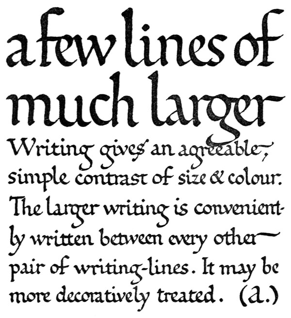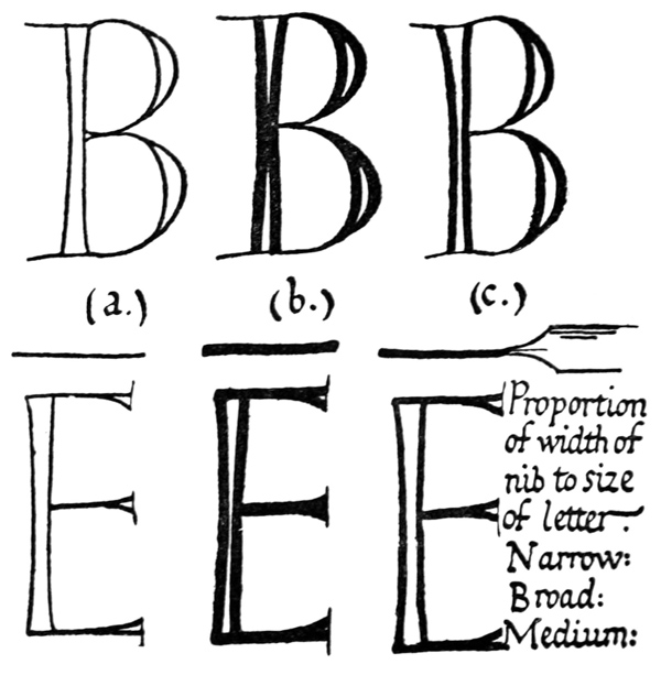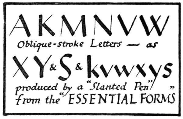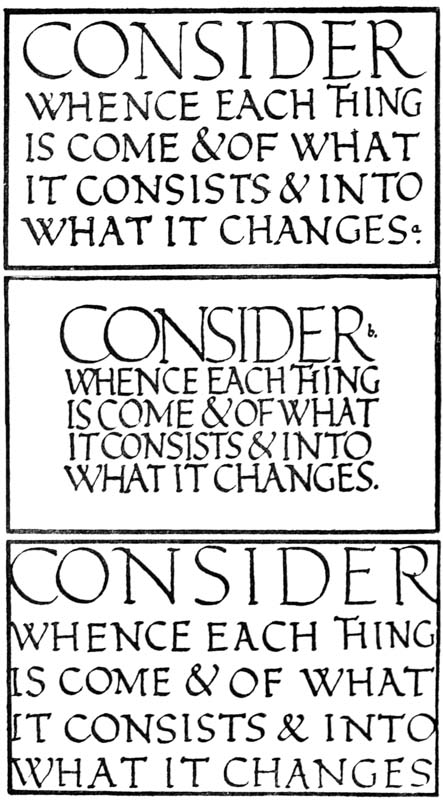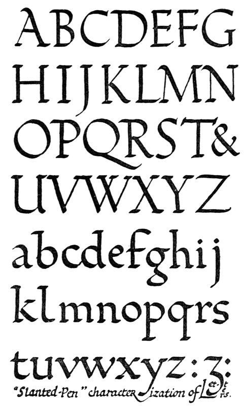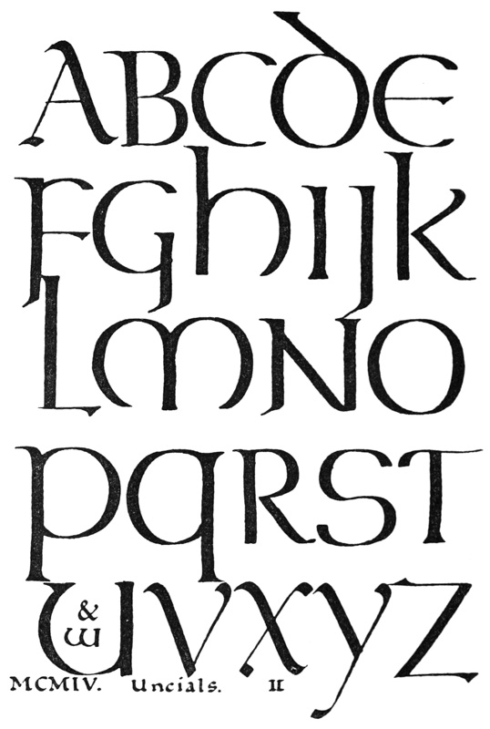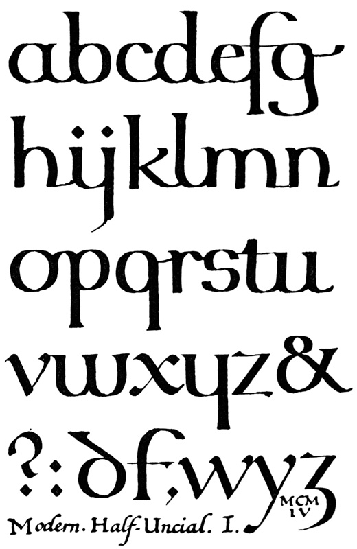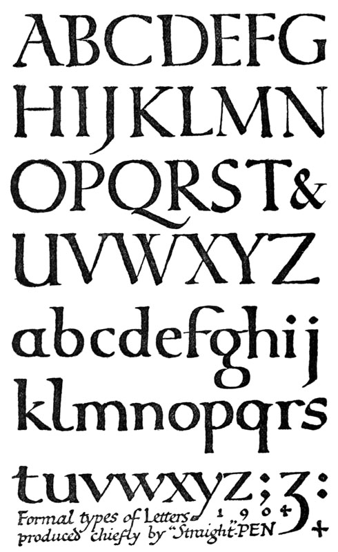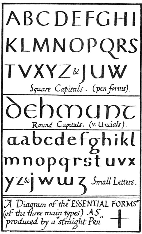 Yet Ordinary Writing and even scribbling has had, and still might have, a good influence on the art of the Letter maker, and at least the common use of pen, ink, & paper makes it a simple matter for any one to essay a formal or ‘book’ hand. A broad nib cut to give clean thick and thin strokes (without appreciable variation of pressure) will teach any one who cares to learn, very clearly and certainly. And though much practice goes to the making of a perfect MS., it is easier than people suppose to make really beautiful things by taking a little pains. As “copy book” hands simple, primitive pen-forms—such as the Uncial & Half-Uncial (pp. 38, 70)—afford the best training and permit [p-xvi] the cultivation of the freedom which is essential in writing: they prepare the way for the mastery of the most practical characters—the ROMAN CAPITAL, roman small-letter, & Italic—and the ultimate development of a lively and personal penmanship.