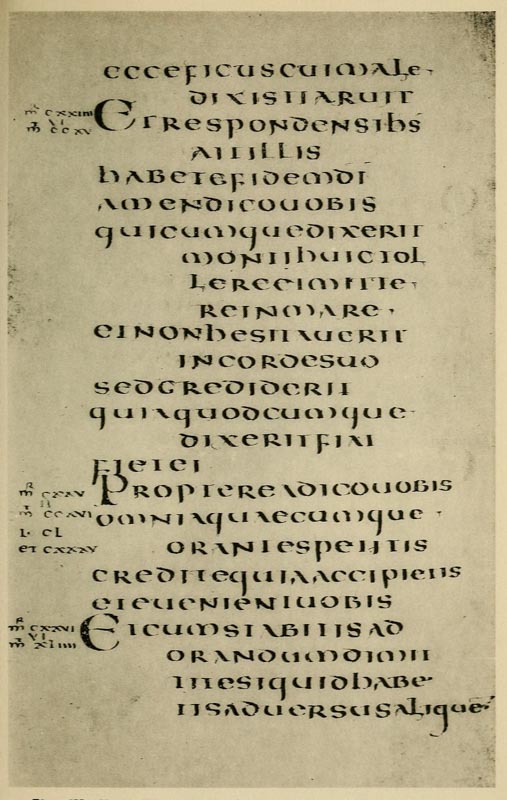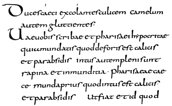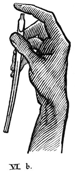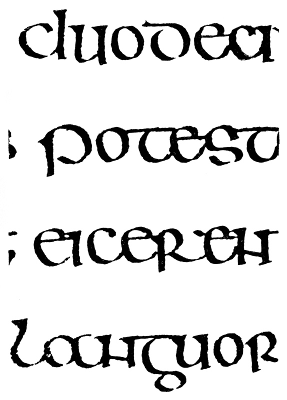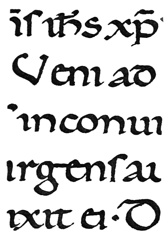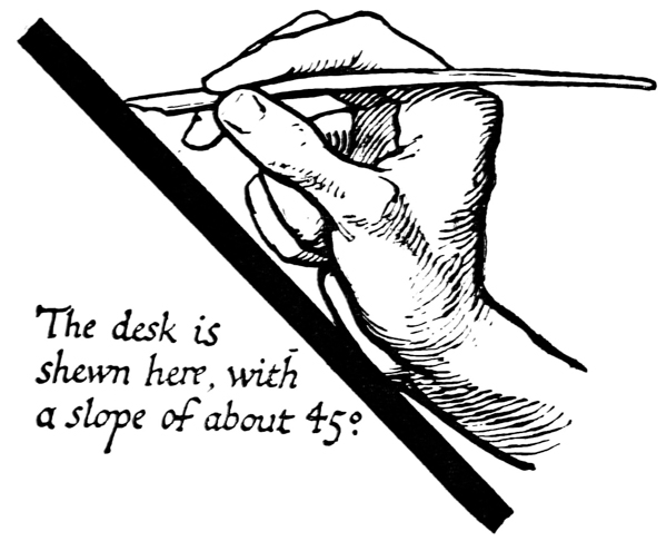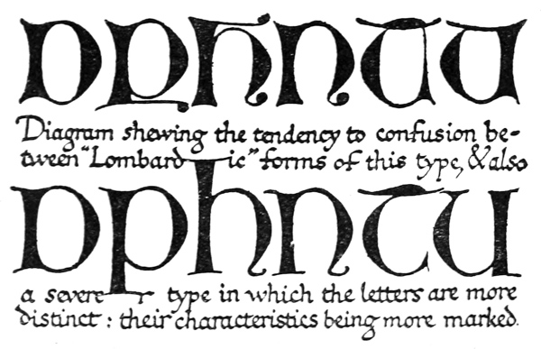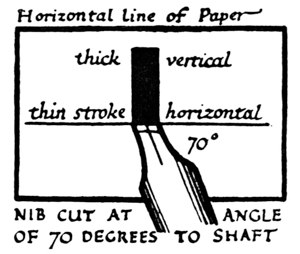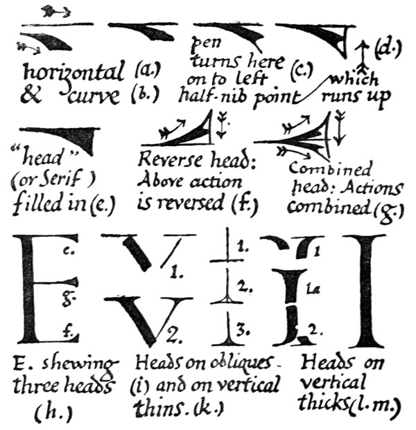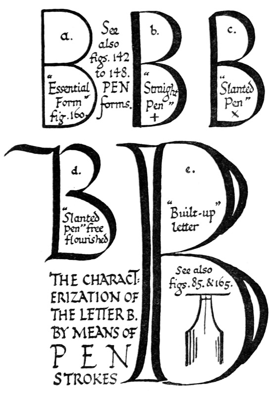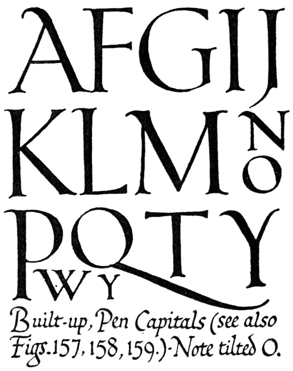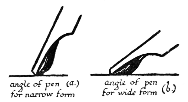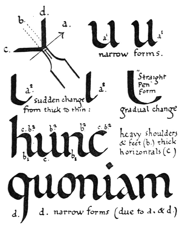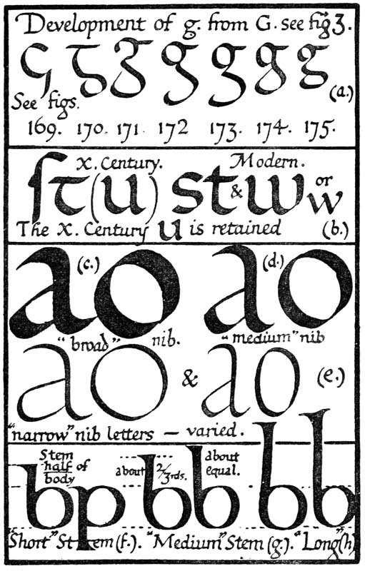 P. 63. Until the simple pen-stroke forms are mastered, the pen should be used without appreciable pressure. With practice one gains sleight of hand (pp. 85, 311), and slightly changing pressures & quick movements on to the corners, or points, of the nib are used. The forms in the best MSS. shew such variations; e.g. the Uncials in fig. 5 appear to have been made with varying pressure (perhaps with a soft reed) & their fine finishing-strokes with the nib-point (comp. forms in fig. 146). Versals likewise shew varying, and sometimes uncertain, structures that suggest a form consisting of strokes other than definite pen strokes. [p-xxv]