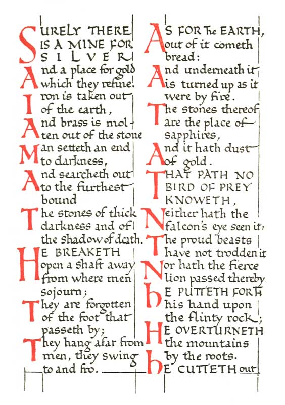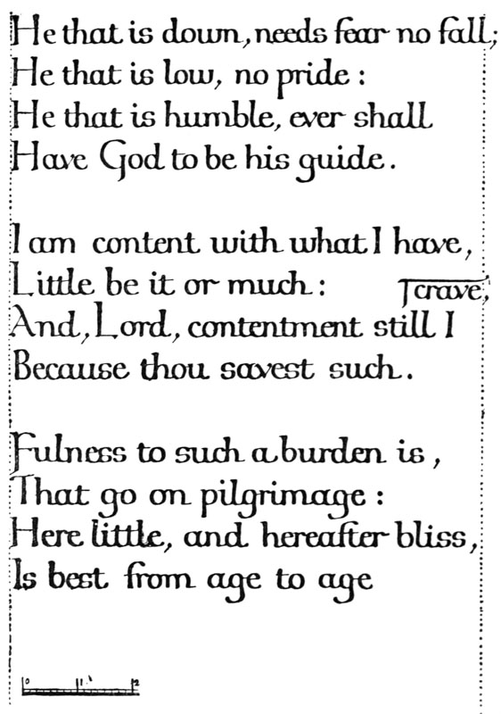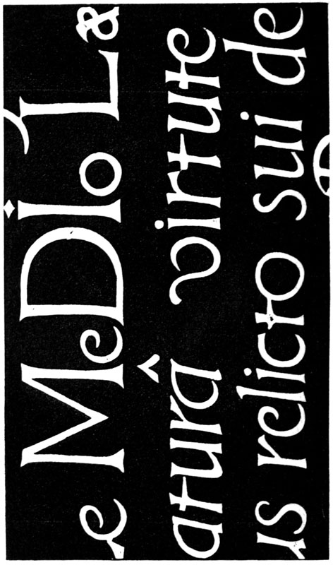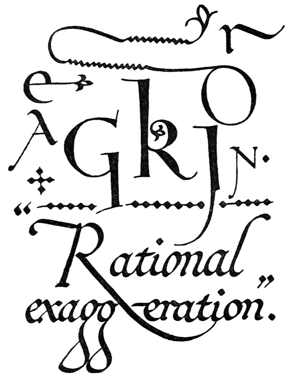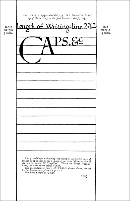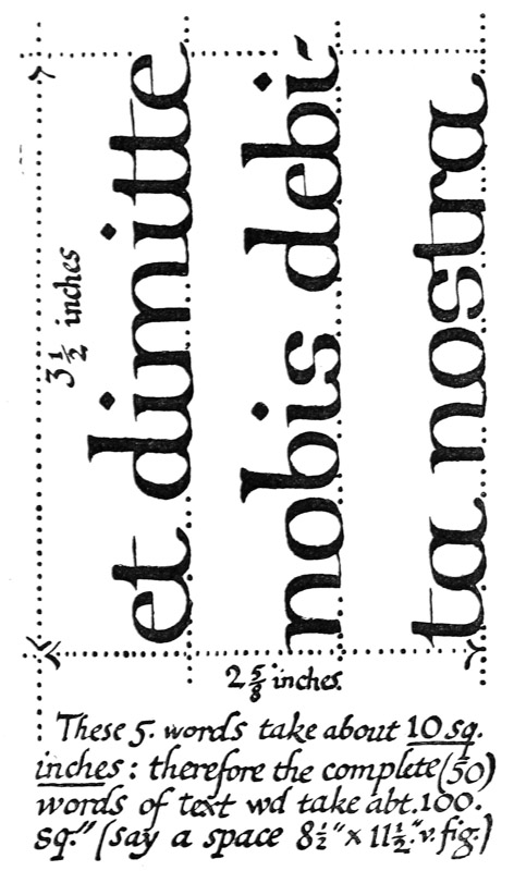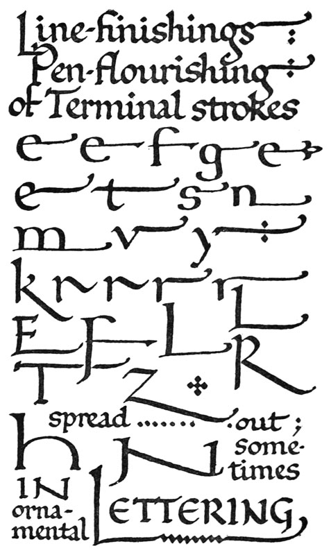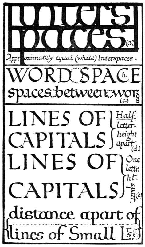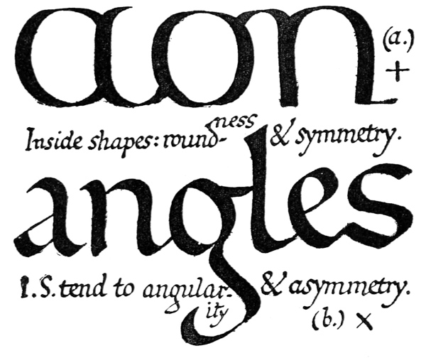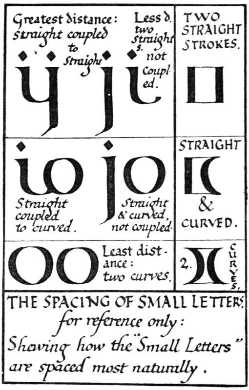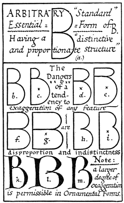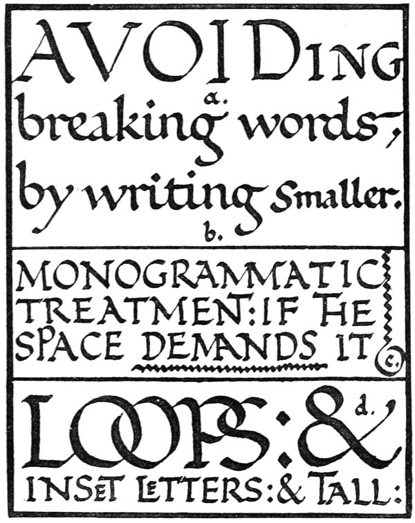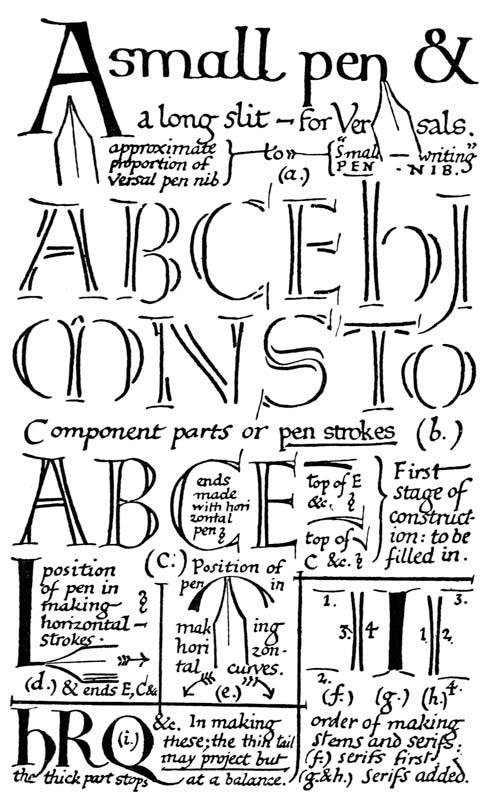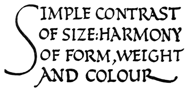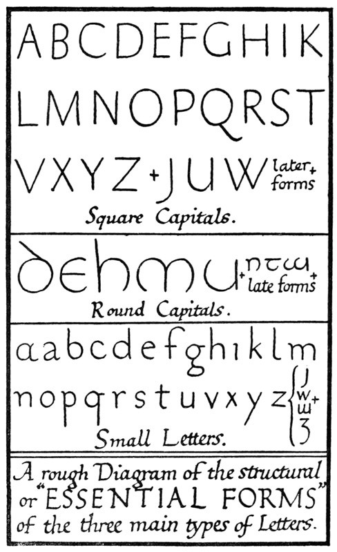 Regarding the copying of early work (see pp. 195, 323, &c.) it is contended that to revive an art [p-xx] one must begin at the beginning, and that, in an honest attempt to achieve a simple end, one may lawfully follow a method4 without imitating a style. We have an excellent precedent in the Italian scribes who went back 300 years for a model and gave us the Roman small-letter as a result (see p. 47). The beginners attitude is largely, and necessarily, imitative, and at this time we should have much to hope from a school of Artist-Beginners who would make good construction the only novelty in their work. We have almost as much—or as little—to be afraid of in Originality as in imitation, and our best attitude towards this problem is that of the Irishman with a difficulty—“to look it boldly in the face and pass on”—making an honest attempt to achieve a simple end. Perhaps we trouble too much about what we “ought to do” & “do”: it is of greater moment to know what we are doing & trying to do. In so far as tradition fails to bound or guide us we must think for ourselves and in practice make methods and rules for ourselves: endeavouring that our work should be effective rather than have “a fine effect”—or be, rather than appear, good—and following our craft rather than making it follow us. For all things—materials, tools, methods—are waiting to serve us and [p-xxi] we have only to find the “spell” that will set the whole universe a-making for us.